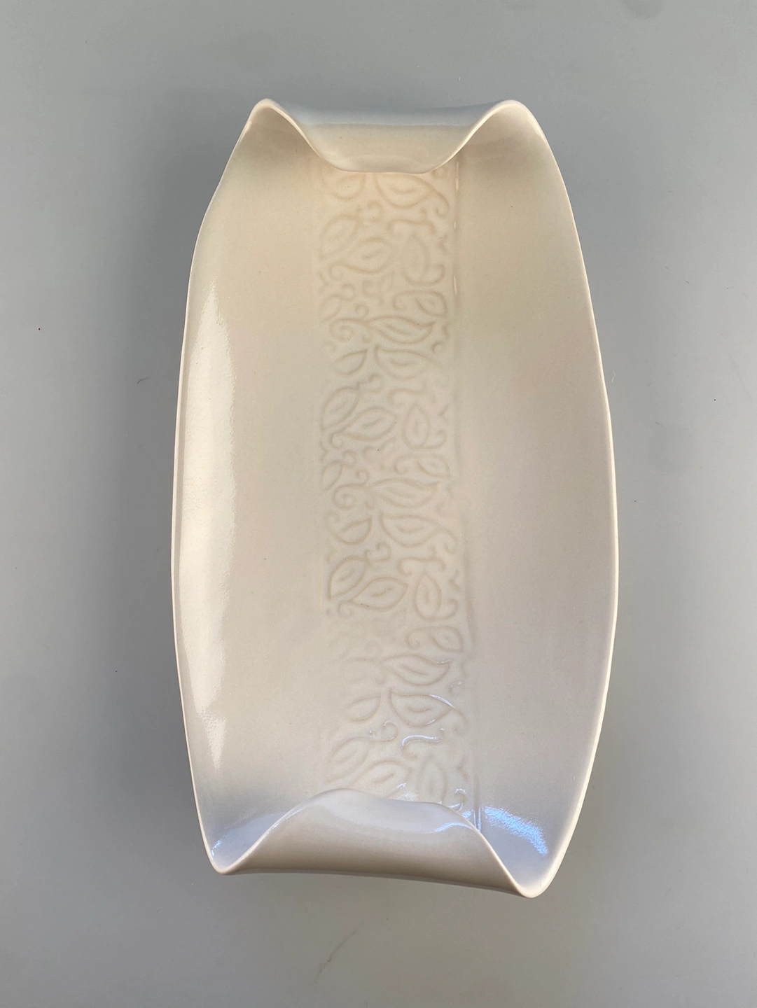 Perfect for entertaining or everyday use, this large handmade white glaze plate from Hilborn Pottery can be used for just about anything. This beautiful platter features a unique raised design running down the center and curled edges. Handcrafted in Cambridge, Ontario. One of a kind! Oven, dishwasher & microwave proof and food safe.