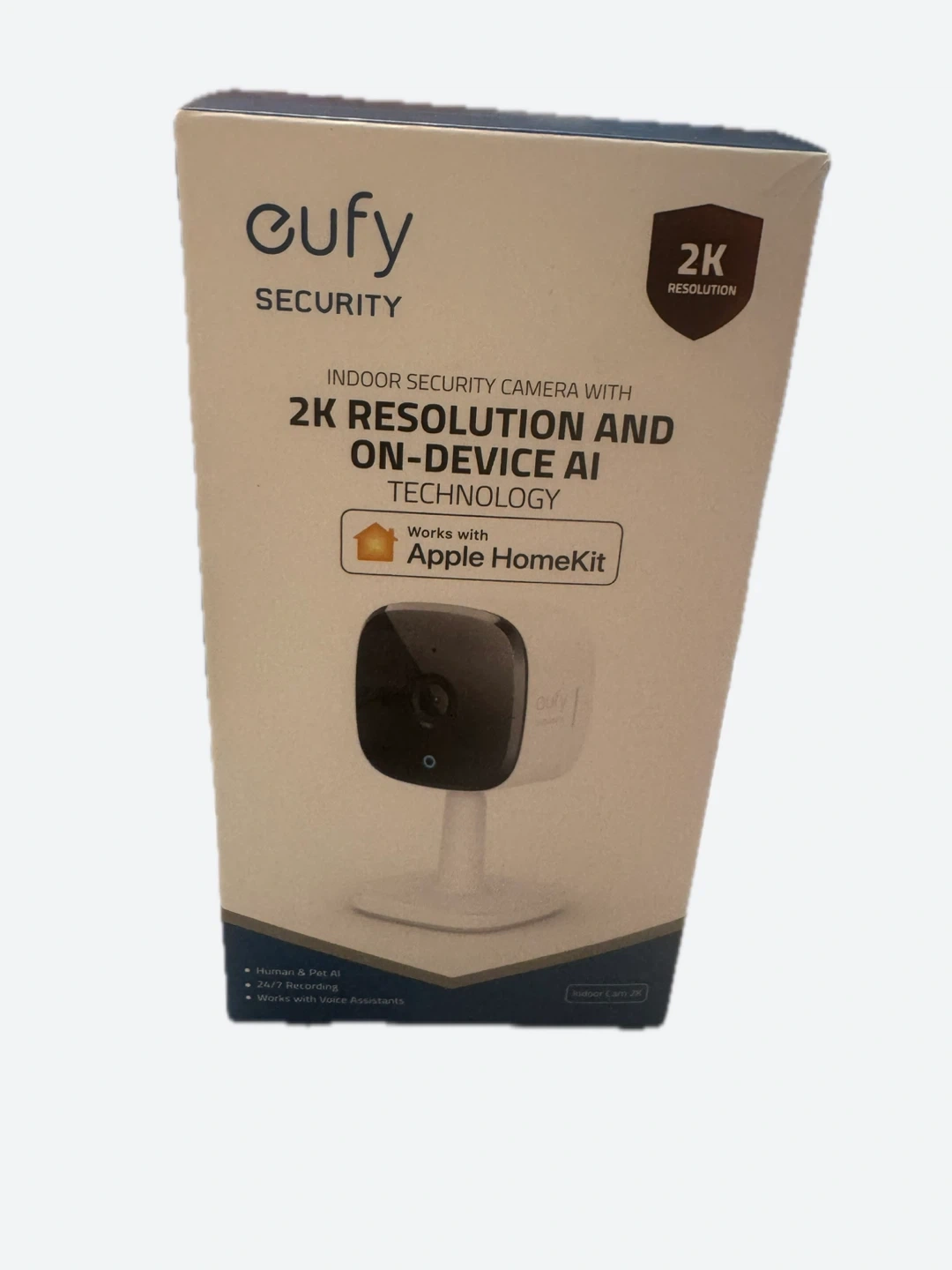 This is an eufy Security Solo Indoor Cam C120 with 2K resolution. It features on-device AI technology for human and pet detection. The camera works with Apple HomeKit and supports 24/7 recording. It's a plug-in camera with Wi-Fi and IP connectivity. Selling it as I am moving and no longer need it.