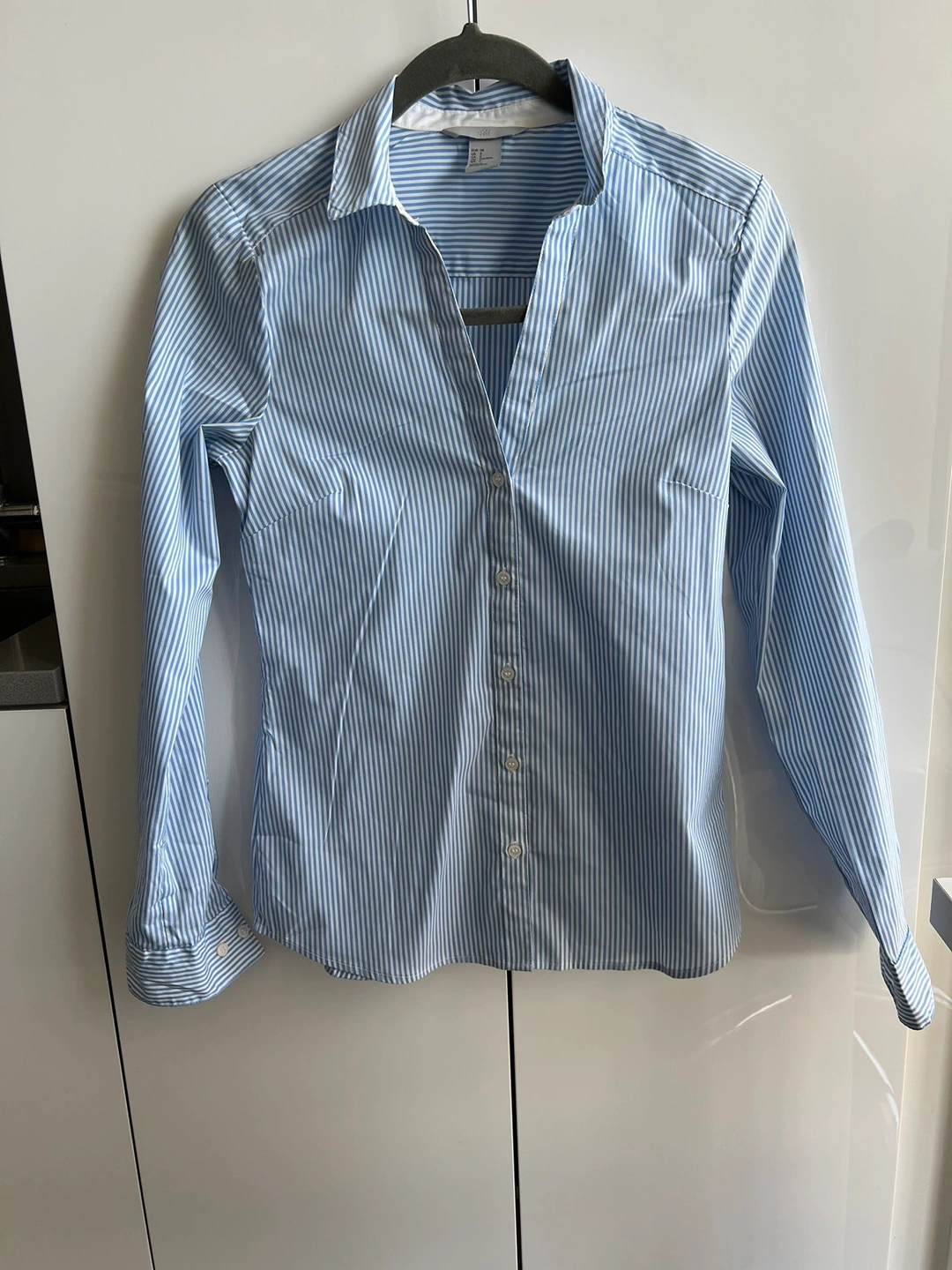 Fitted, long-sleeved shirt in a stretch cotton blend with a V-neck, turn-down collar and buttons down the front and at the cuffs.