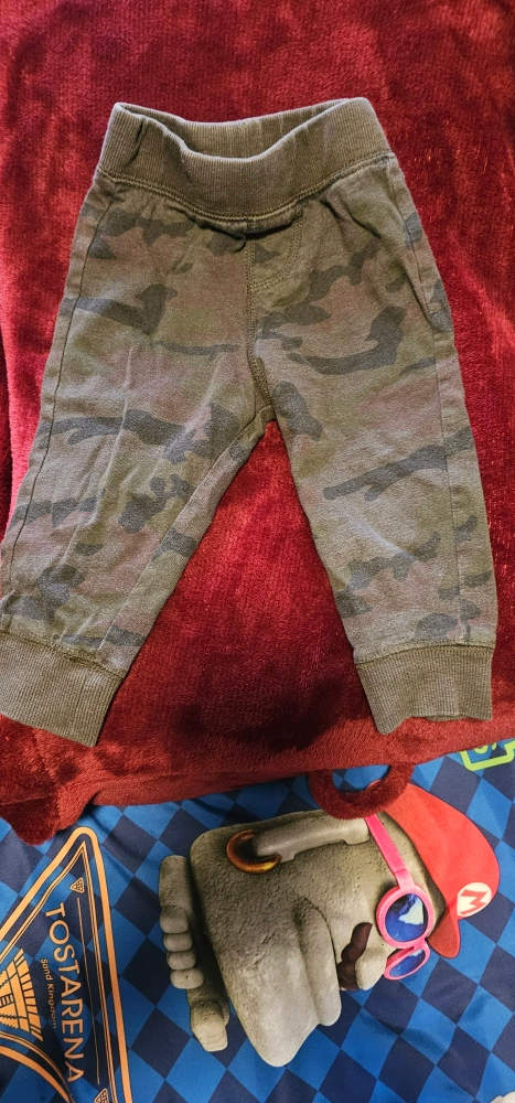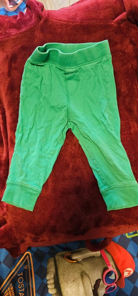 Red vest is 18 months old. Green jogger pants 6 to 12 months old