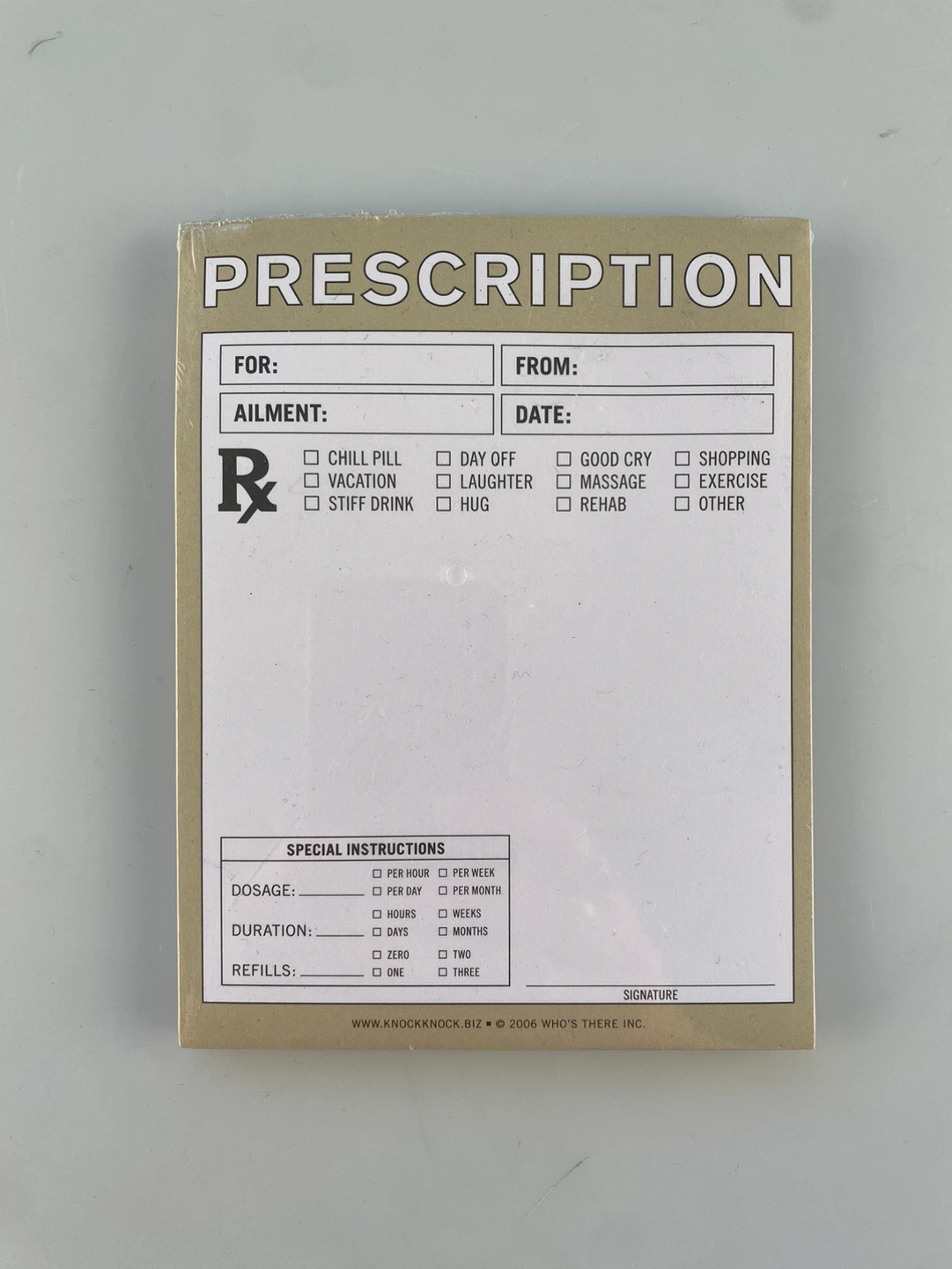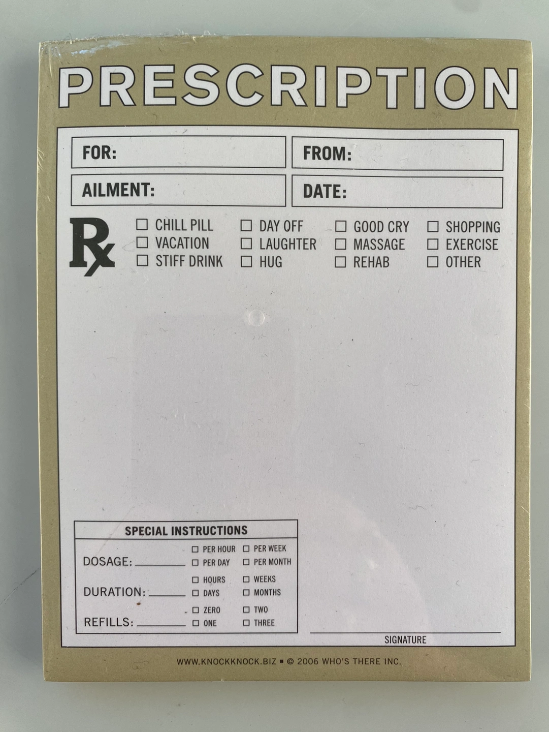 Do you think that you know just what the Dr. would order? Give your co-workers, family and friends personalized prescriptions. Does someone you know need a hug or a good cry? There’s a box for that! Don’t forget to write something illegible in the white space.