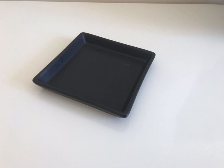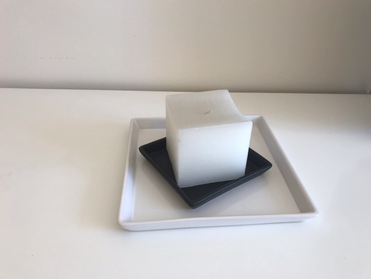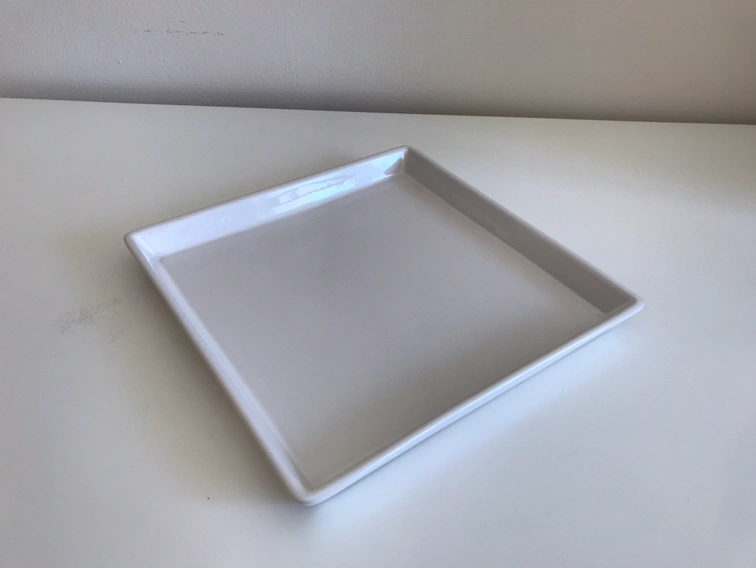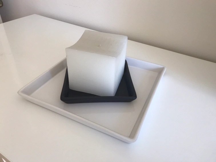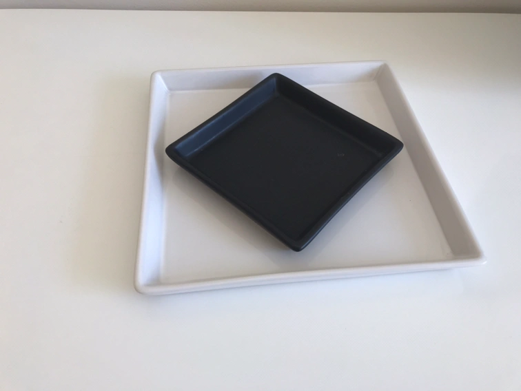 One white decor plate (10” x 10”), one smaller black decor plate and one white candle