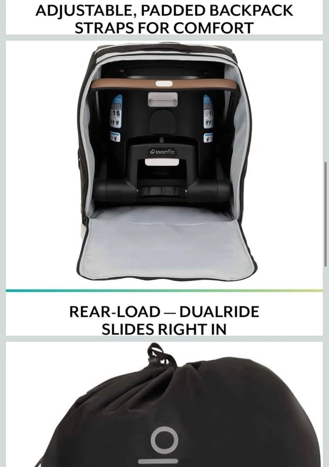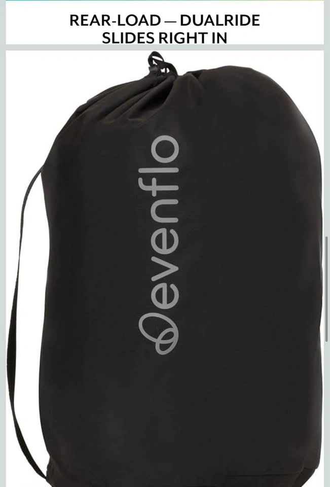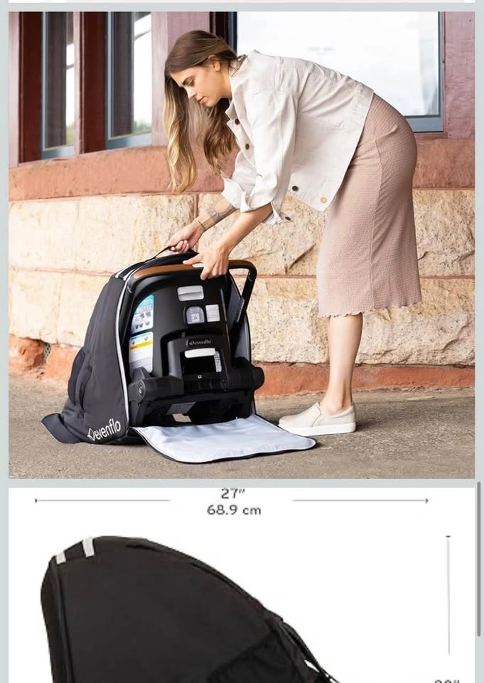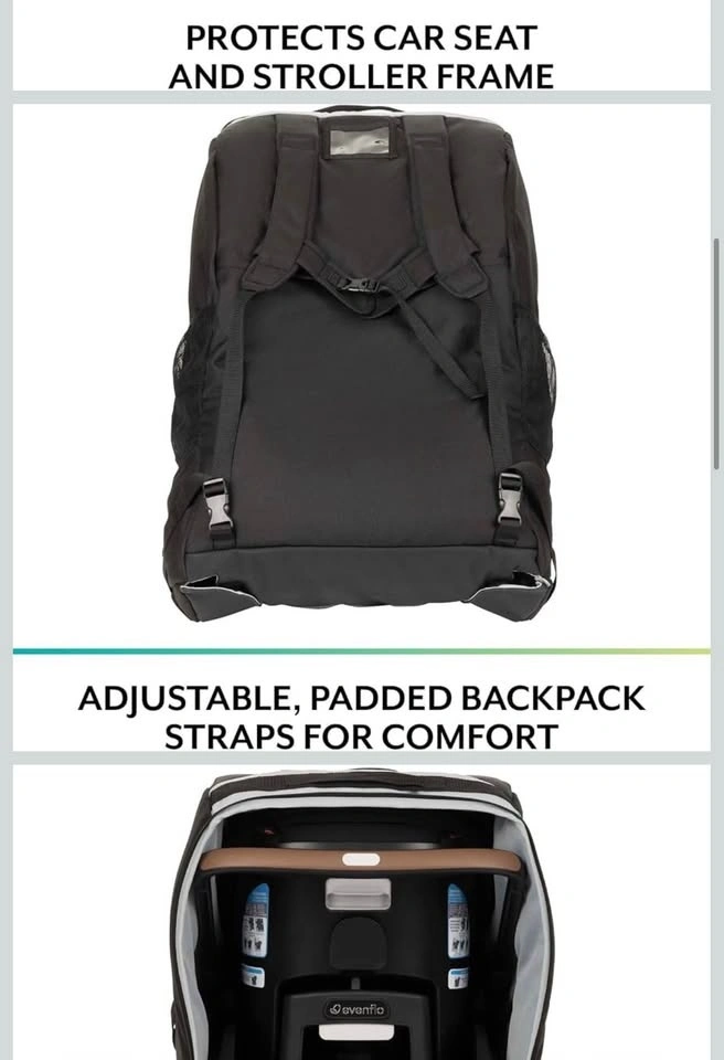 Lightweight padded polyester travel bag. Backpack style straps with chest clip for comfortable carrying. Strong chrome zipper for easy loading. Wheel access flaps for easy airport rolling. Top carry handle for quick pickup. Includes 2 mesh side pockets, luggage tag & drawstring storage bag. Perfect for protecting your Evenflo Shyft DualRide stroller during travel.