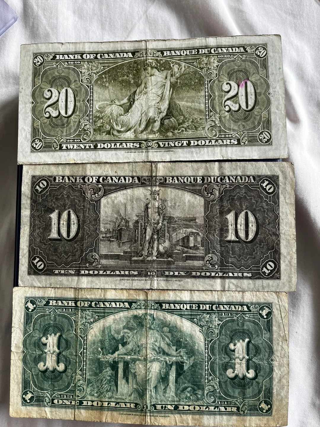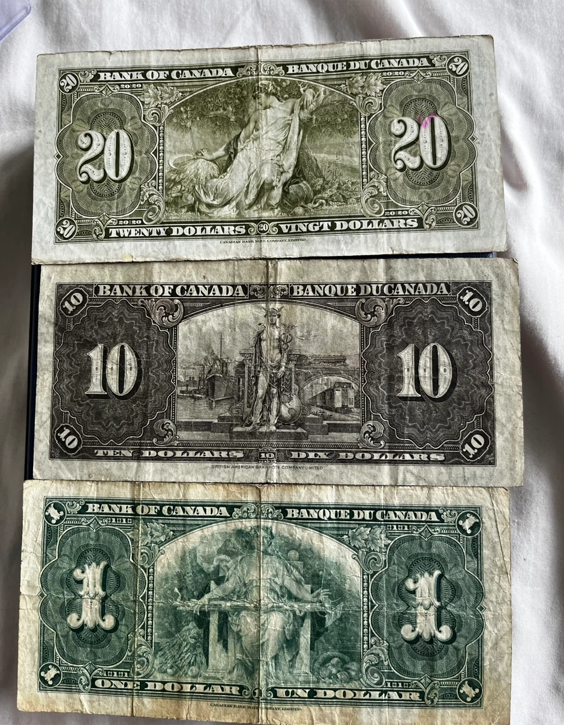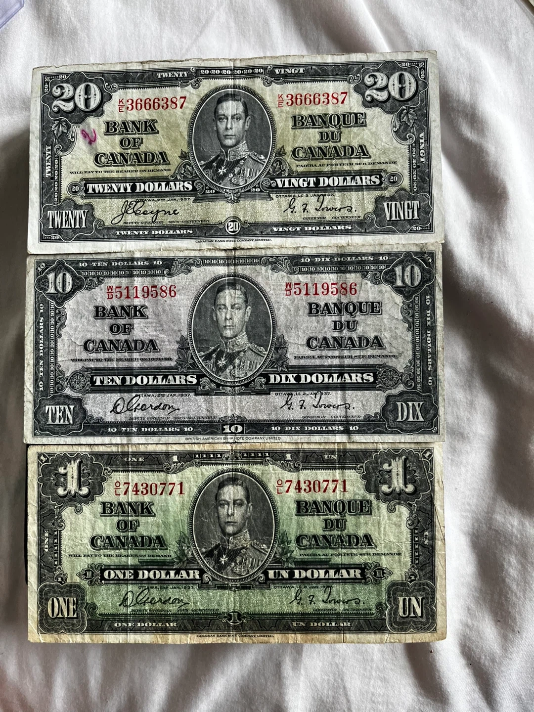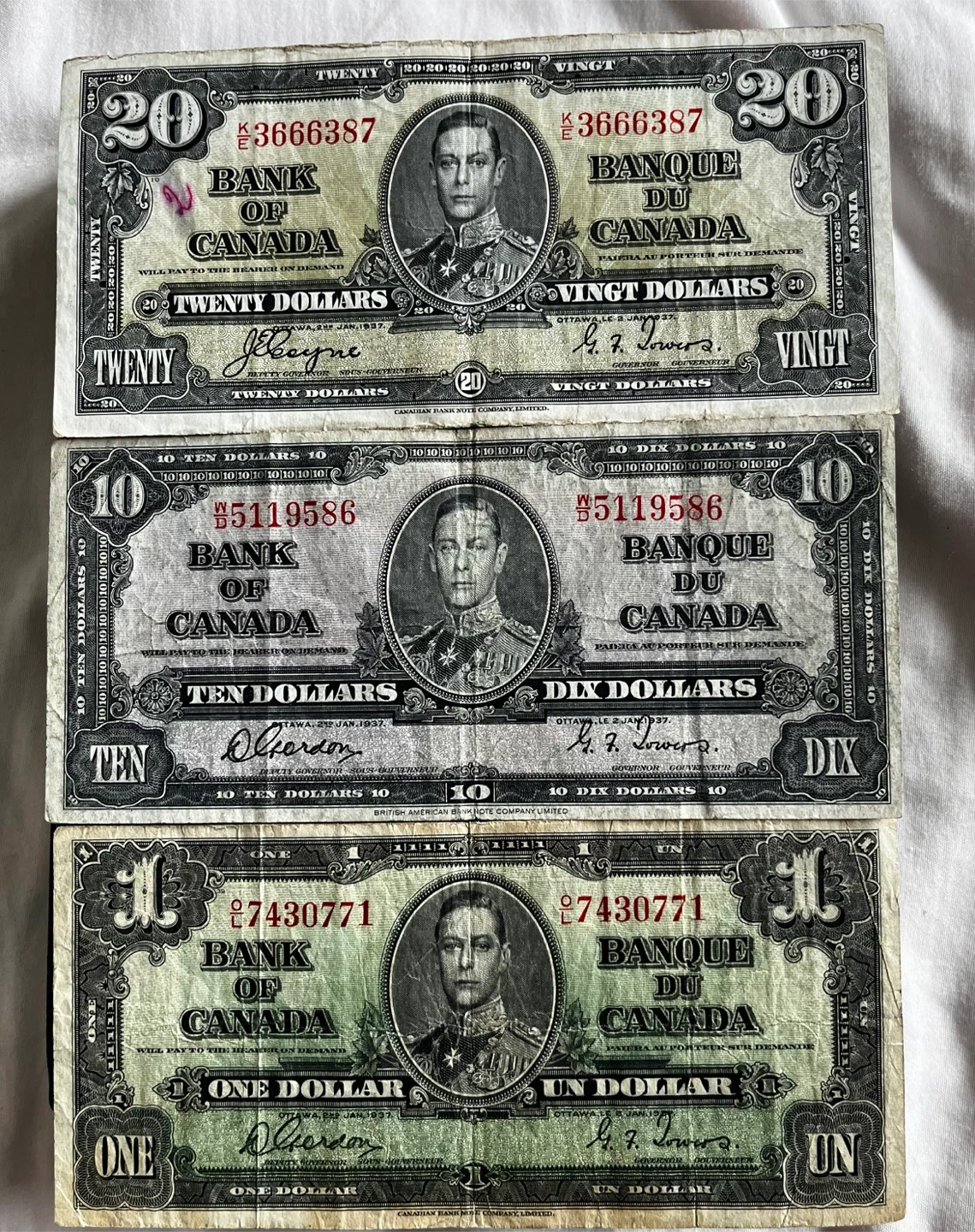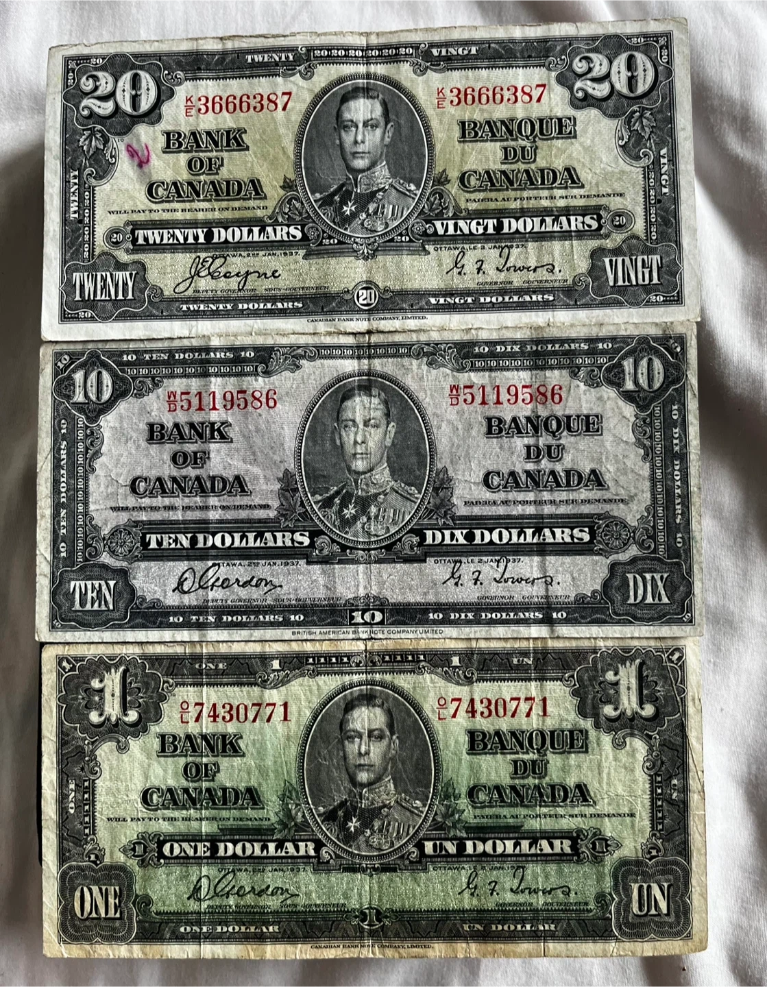 1937 Bank of Canada Currency Set - $1, $10, $20 Bills