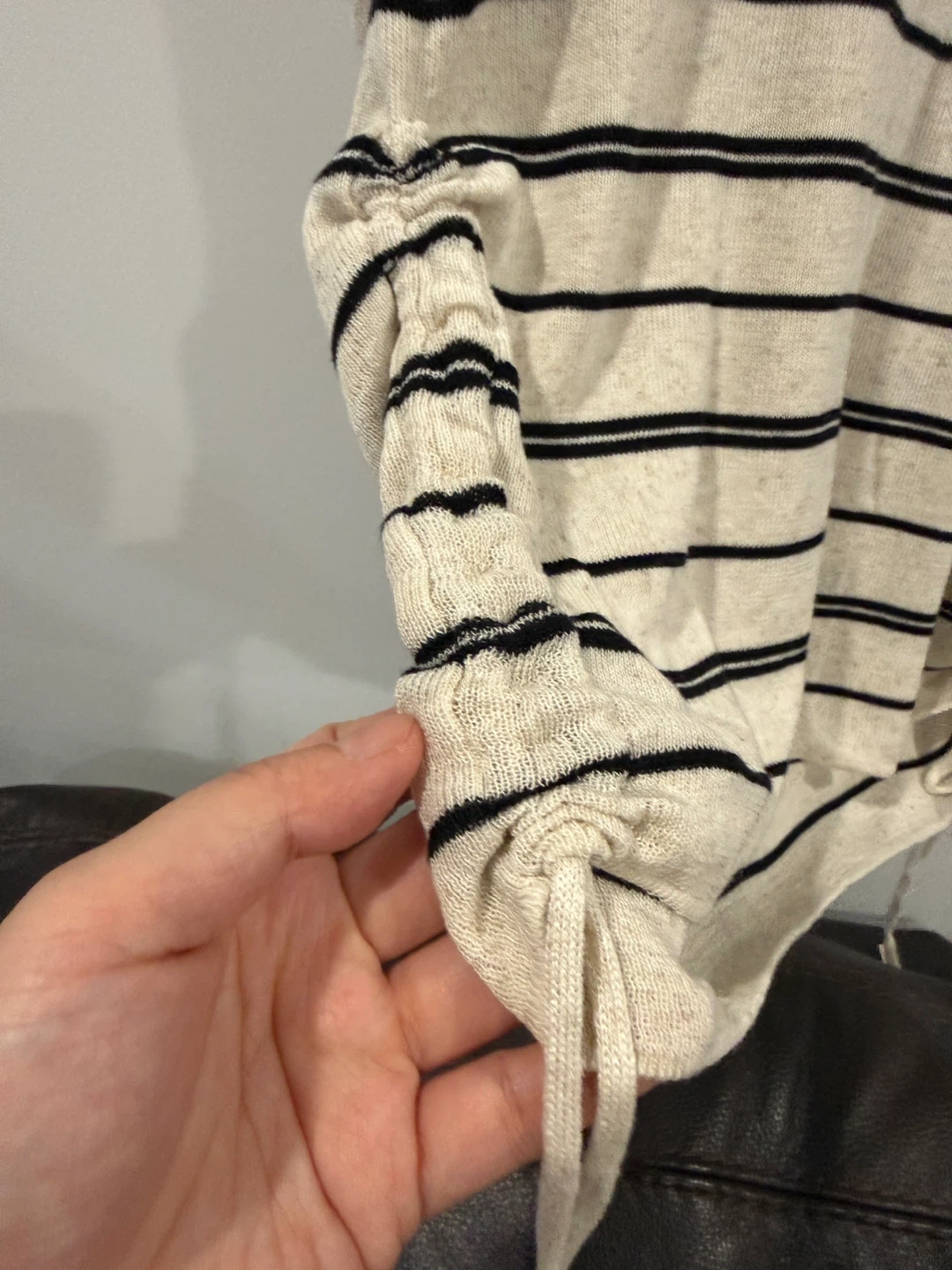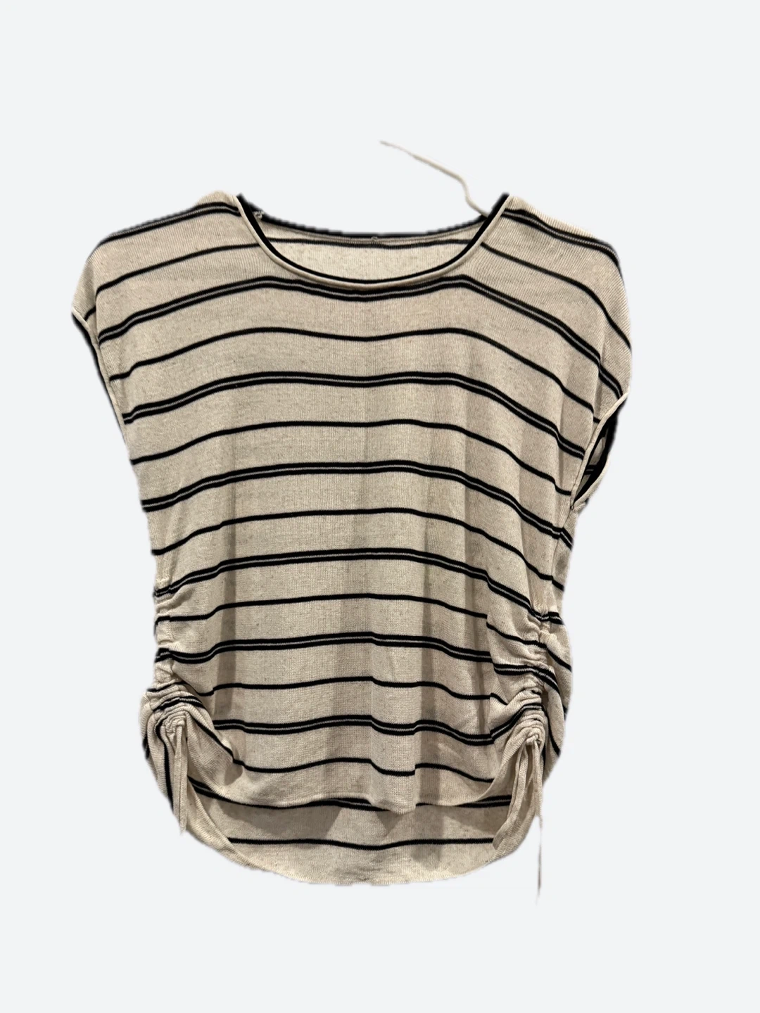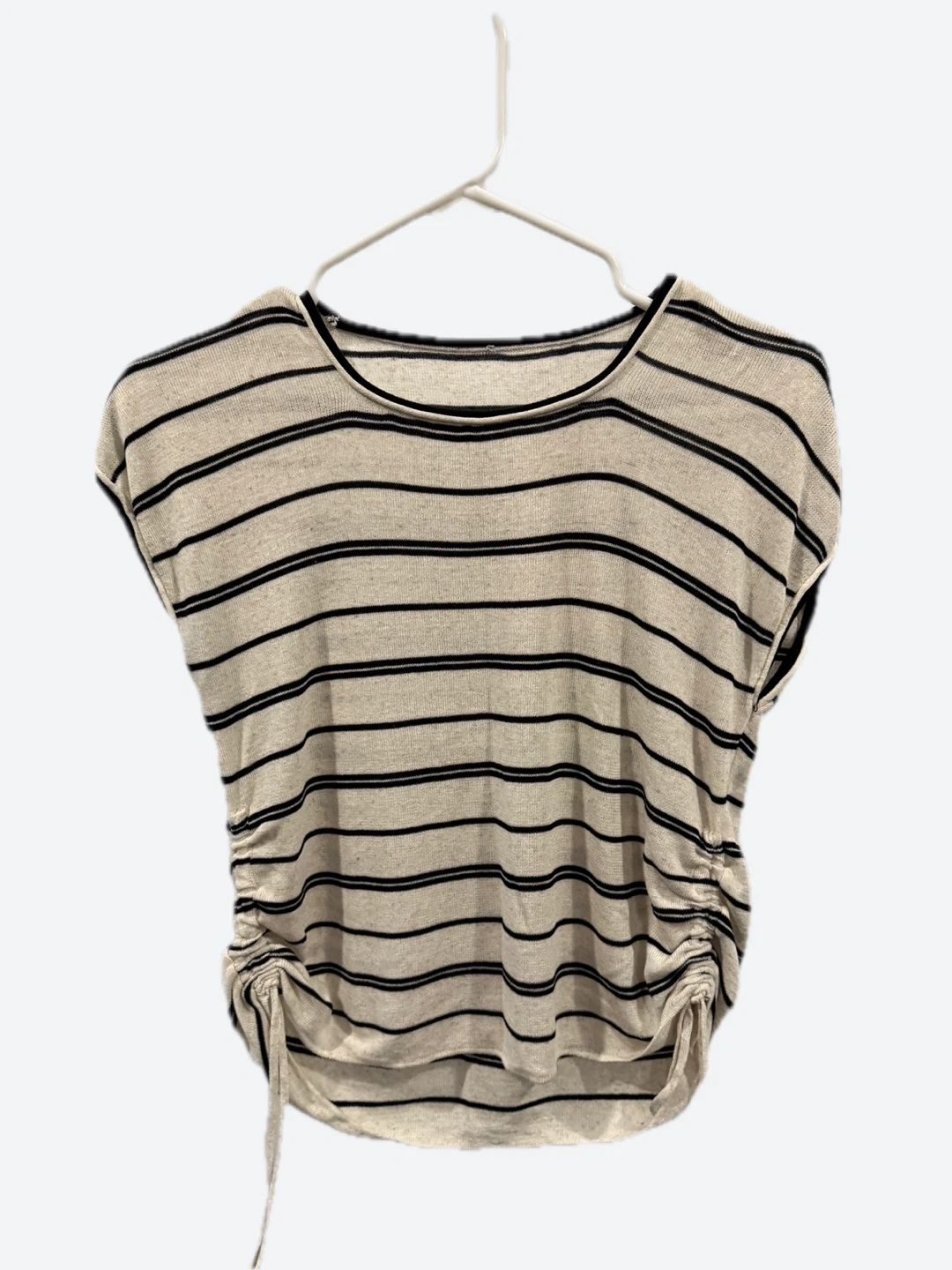 Casual striped t-shirt with adjustable side ruching. It's made from a lightweight knit fabric. This top is great for a relaxed everyday look!
