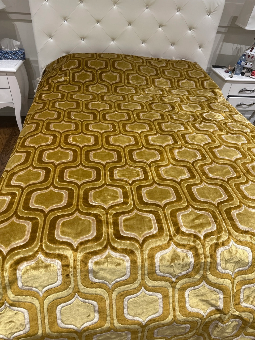 Large, luxurious gold velvet throw blanket. Features a unique geometric pattern. Perfect for adding a touch of vintage glamour to your home.