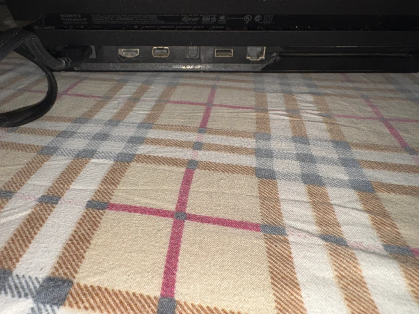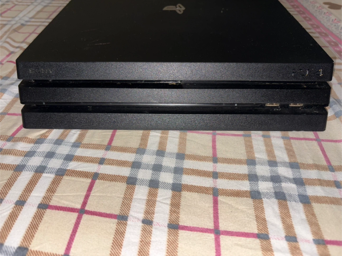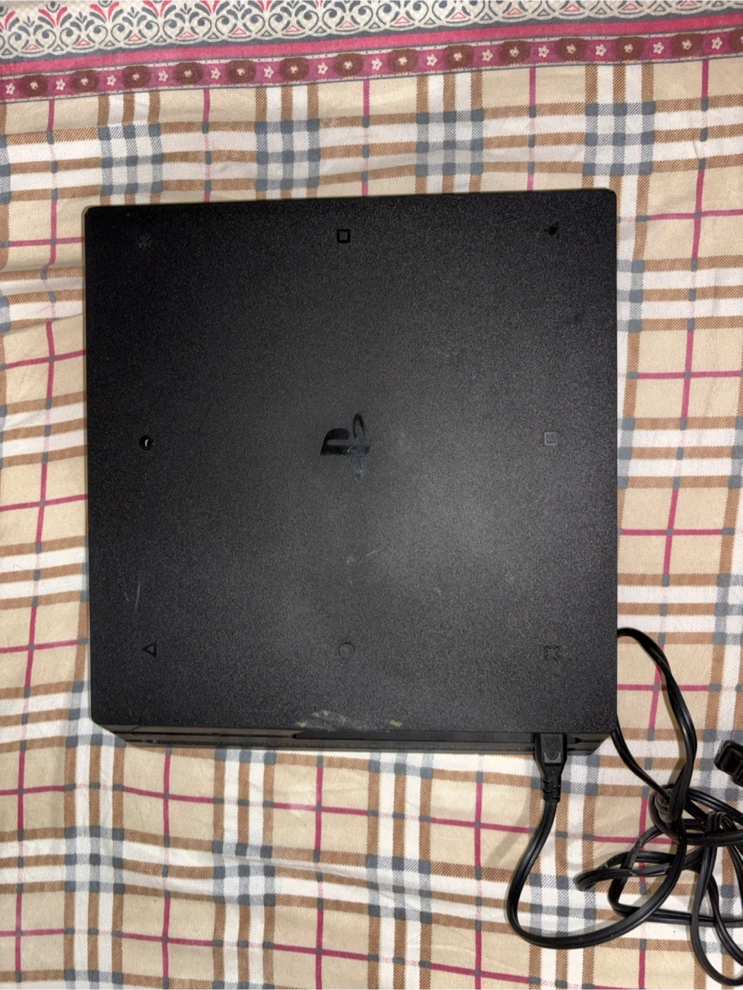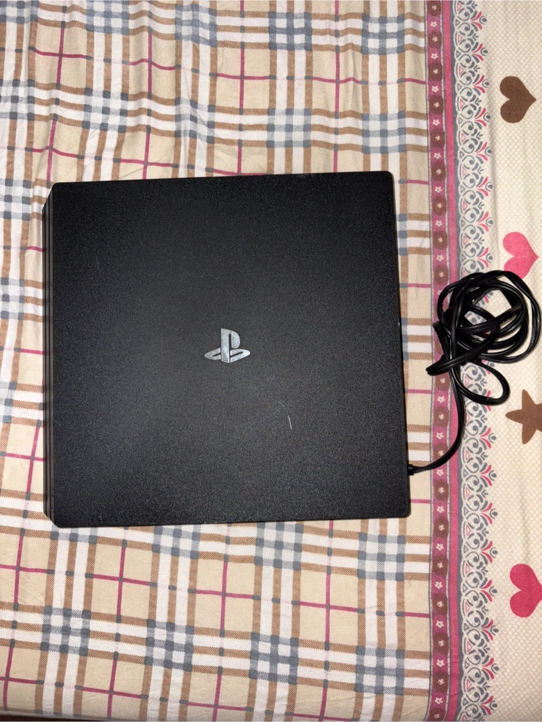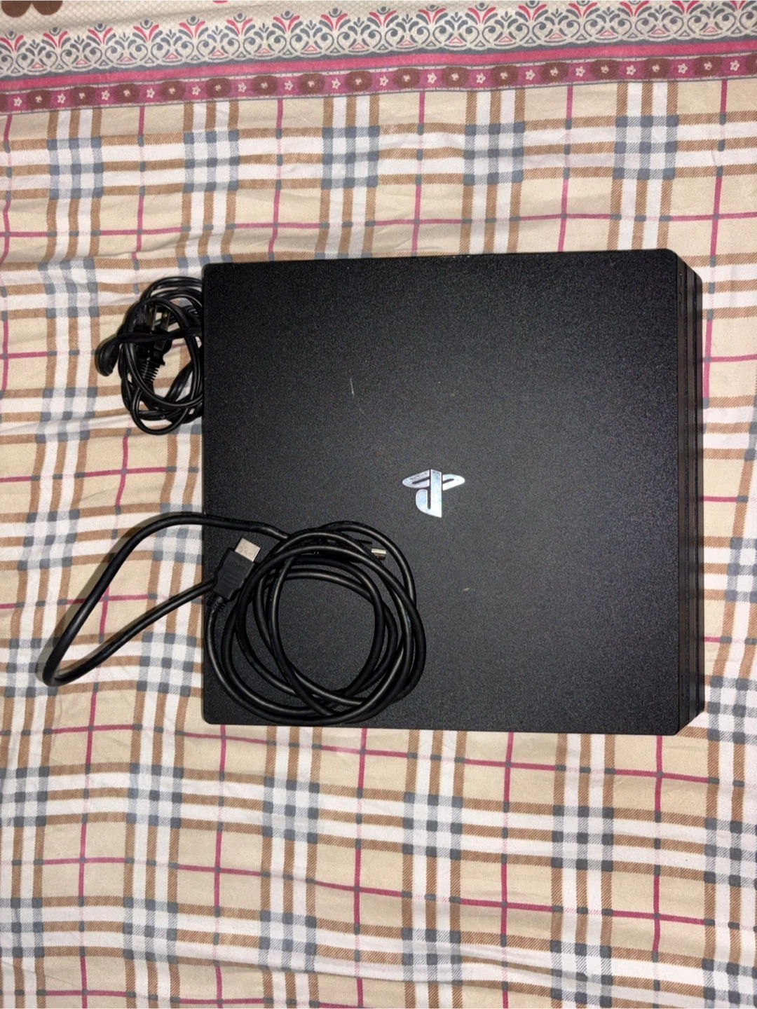 This is a Sony PlayStation 4 Pro console. It's black and includes the power cable. Plays games in 4K.