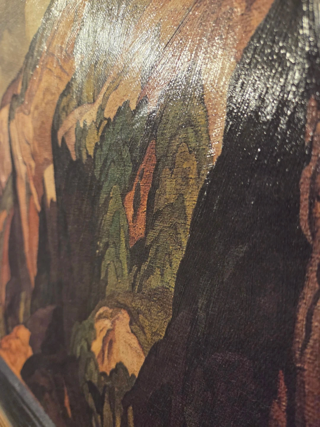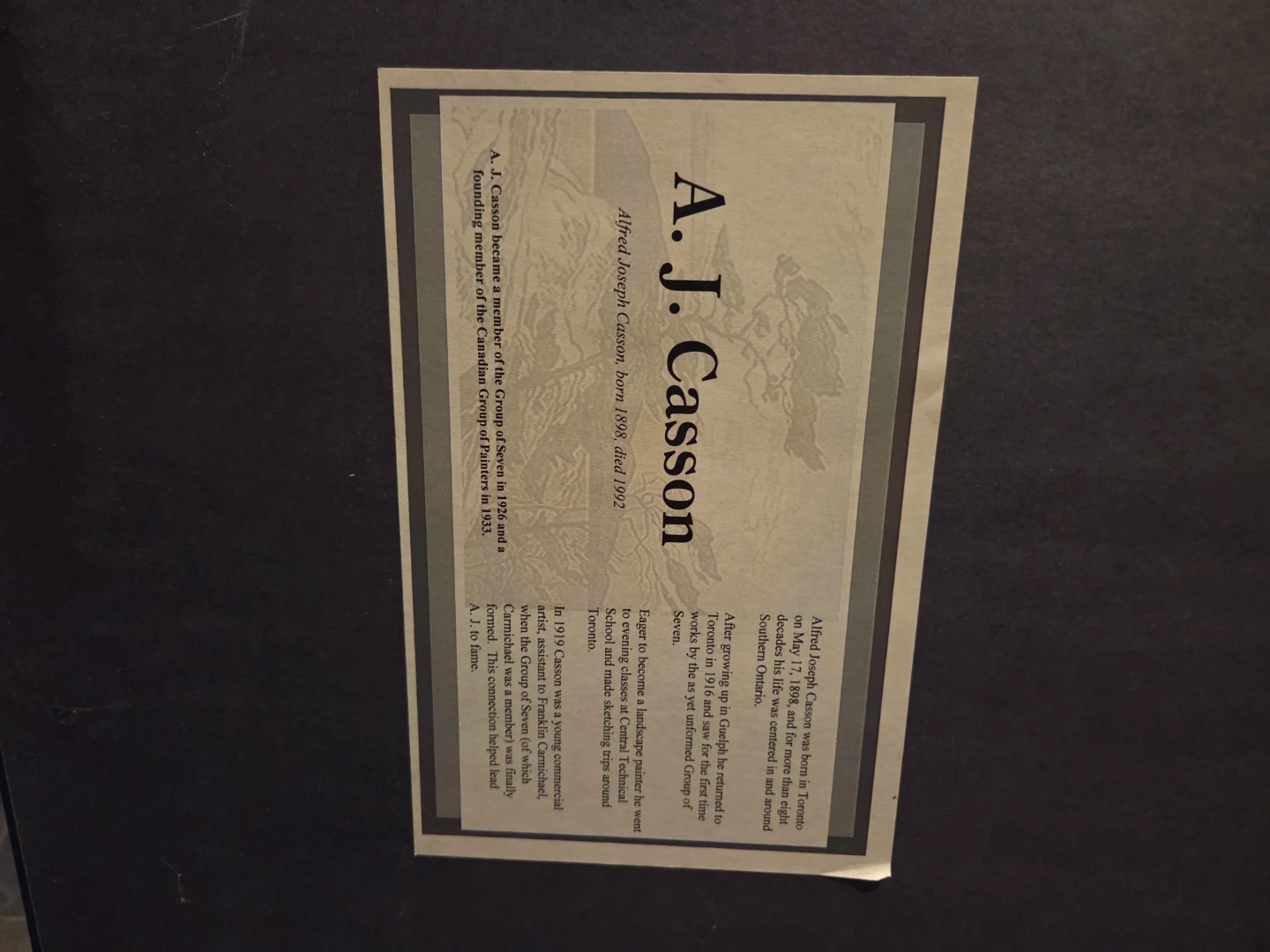 Framed print of A.J. Casson's landscape painting, 'Bon Echo, Lake Manitou'. Alfred Joseph Casson was a renowned Canadian landscape painter. It's a striking depiction of a Canadian natural scene. This piece would be a lovely addition to a home or office.