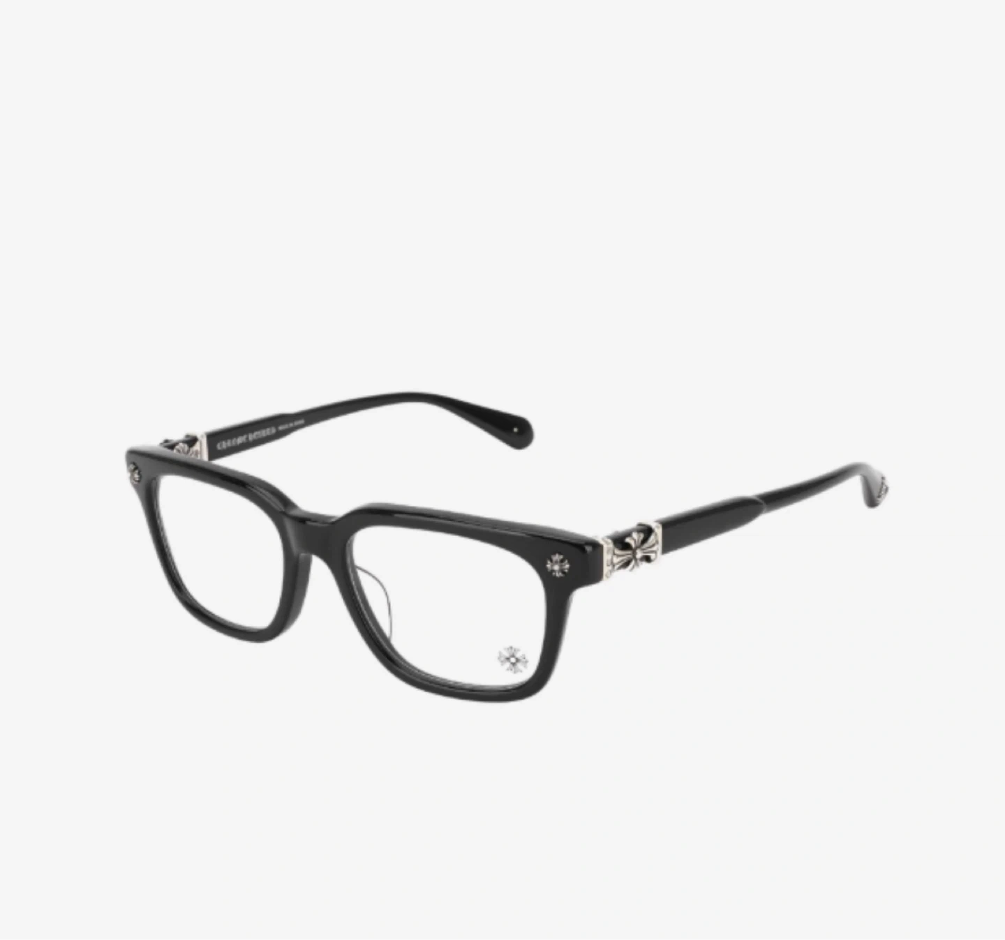 Chrome Hearts black acetate glasses with silver floral cross detailing on the temples. These glasses have a classic rectangular frame shape. They’re opened but not used because wanted to check their quality. So they’re not in a bag but they’re super clean