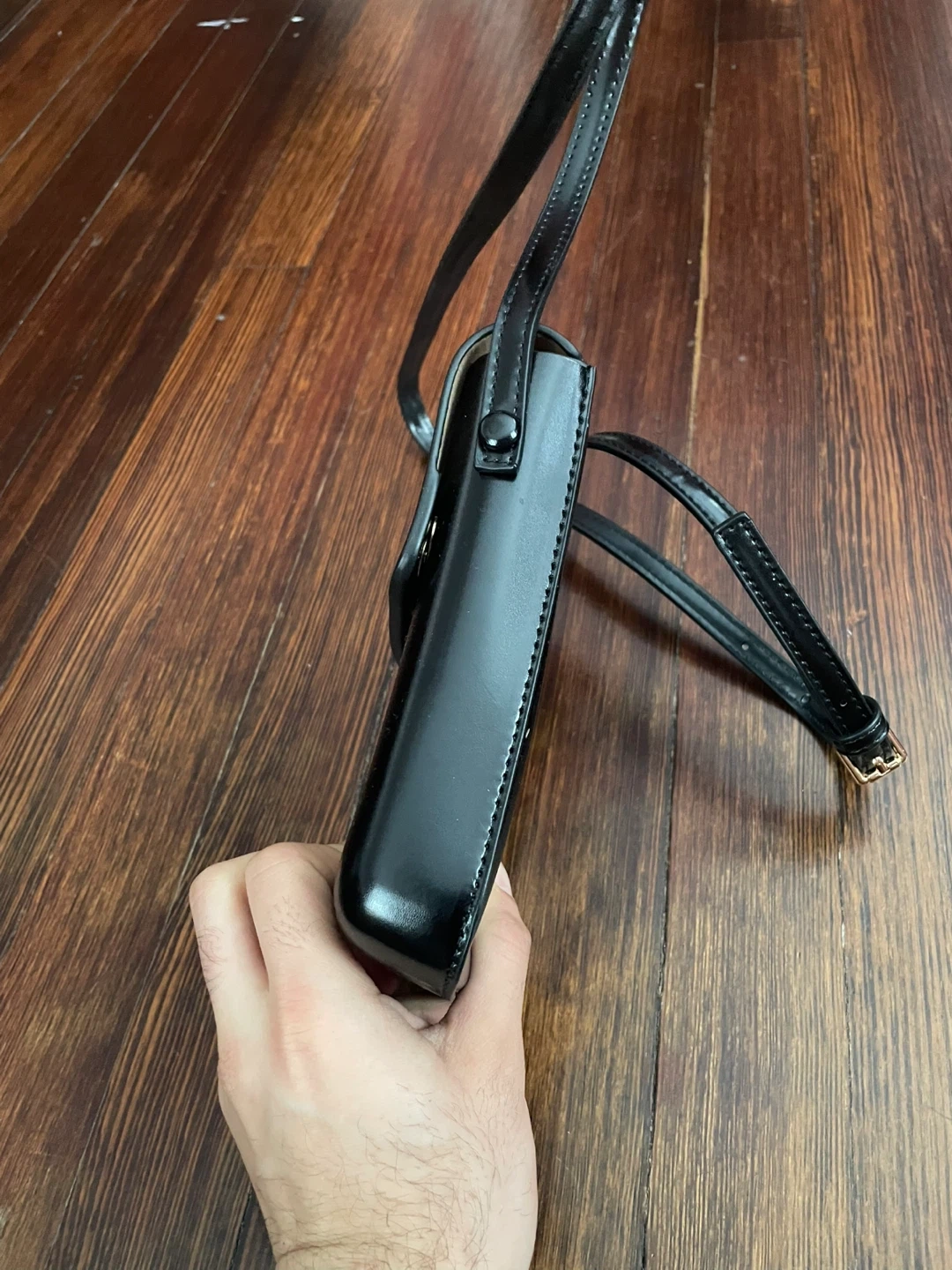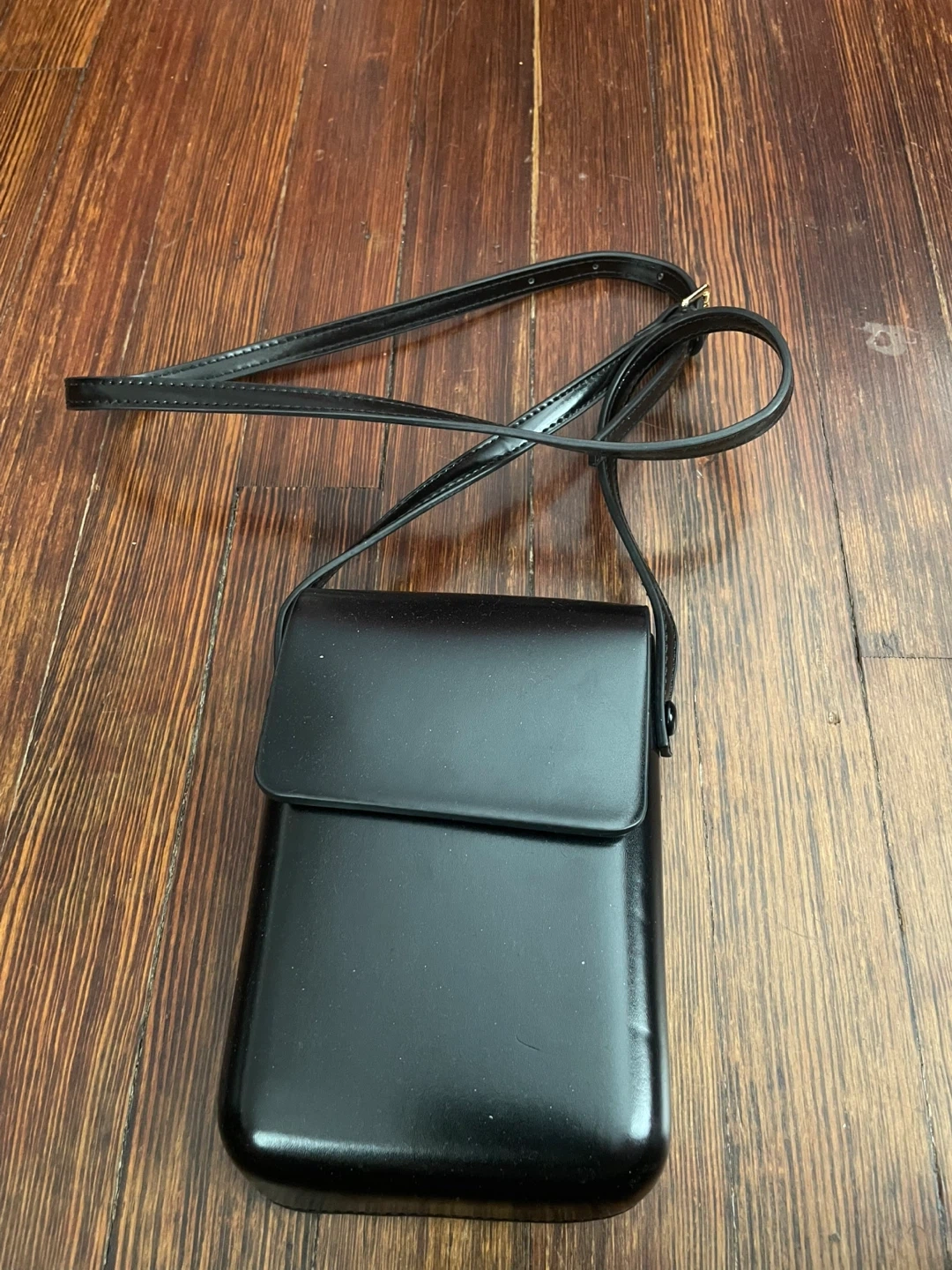 Selling a stylish black leather crossbody bag. It's perfect for carrying your essentials while keeping your hands free! The bag features a sleek design and is made of durable material.