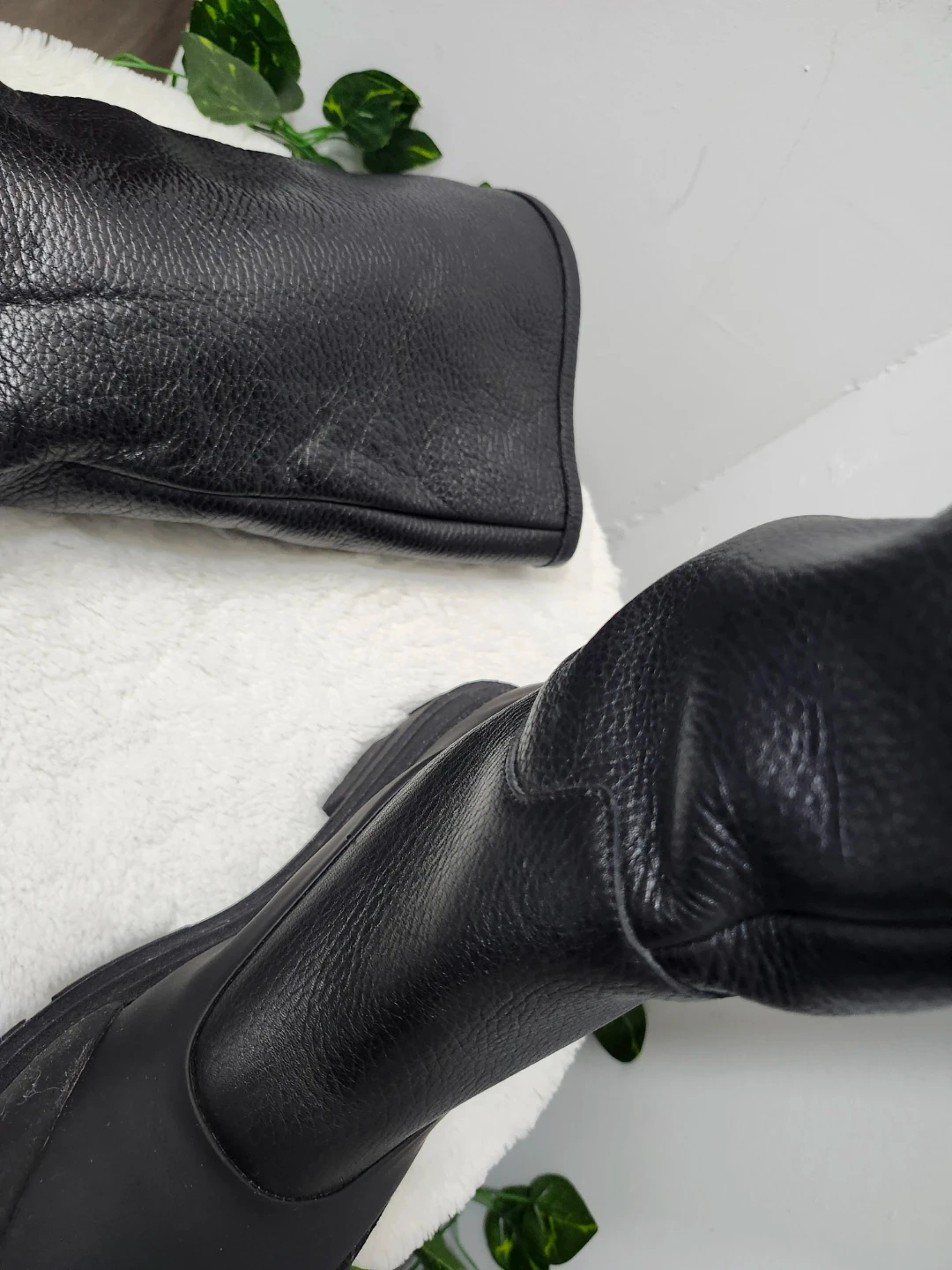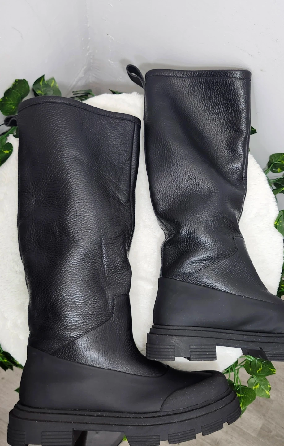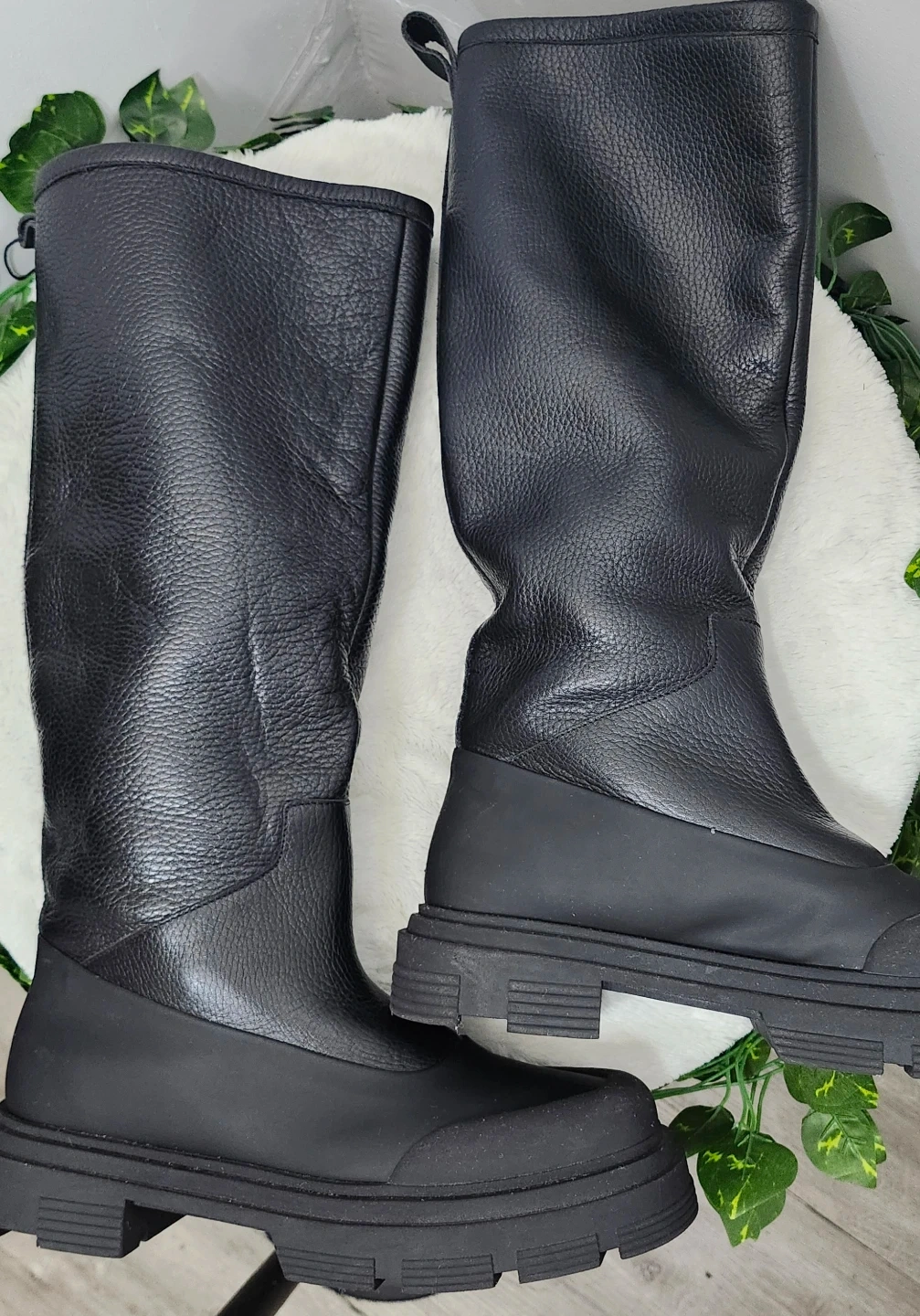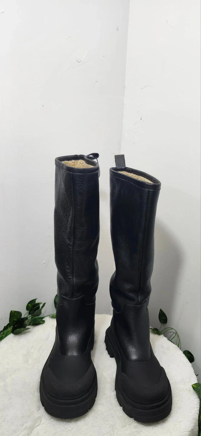 These black leather boots are lined with a soft, warm material, perfect for colder weather. They feature a durable lug sole for traction and a pull-tab at the back.
