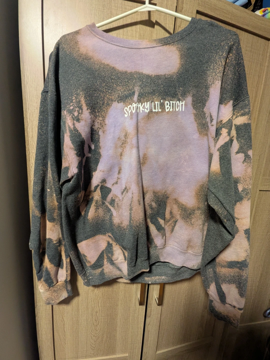 Selling a custom bleach dye pullover sweatshirt with 'spooky lil' b*tch' printed on the front! It's in good condition and has a unique, edgy look. Perfect for adding some fun to your wardrobe. Pet friendly, smoke free home. Pick up only.