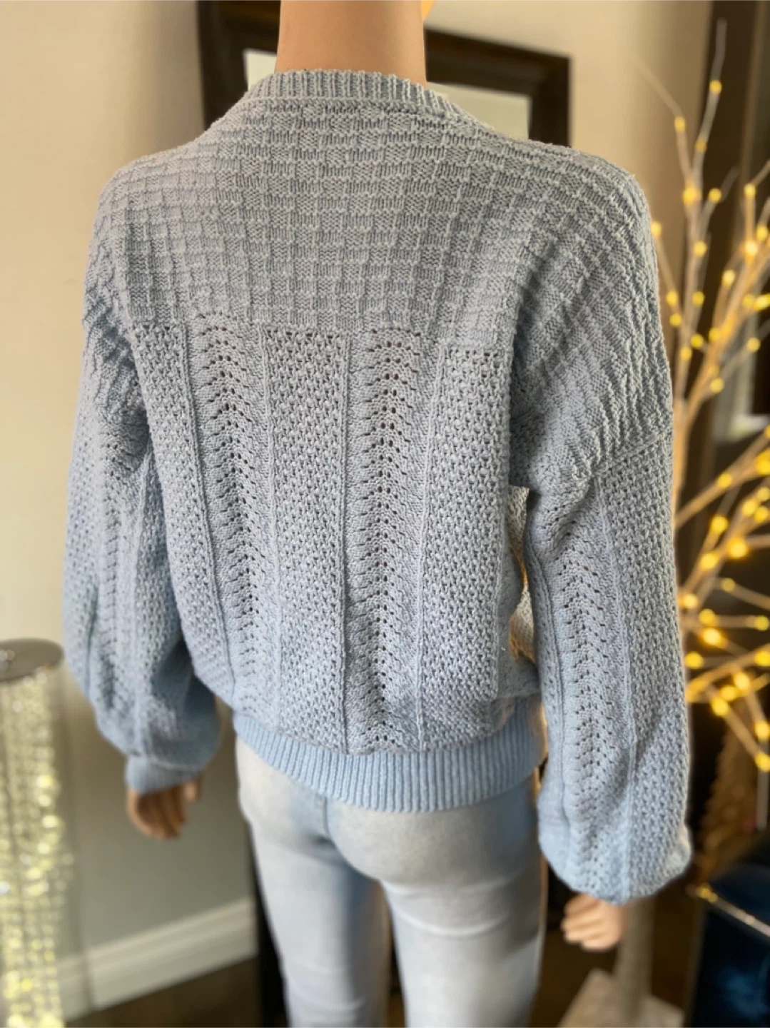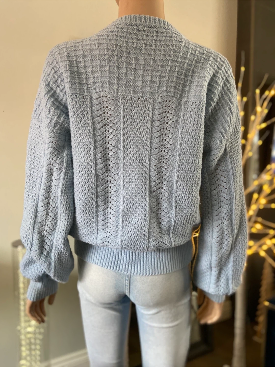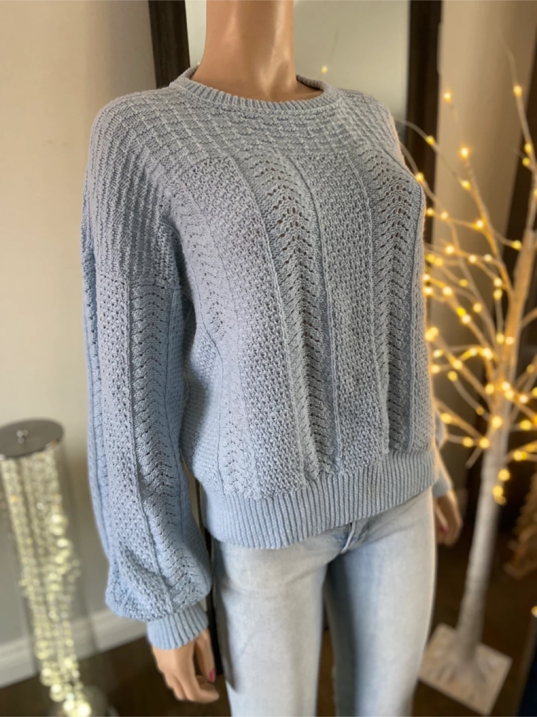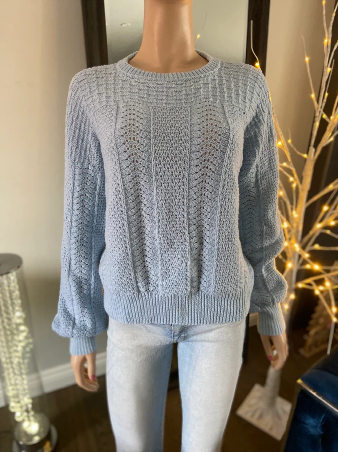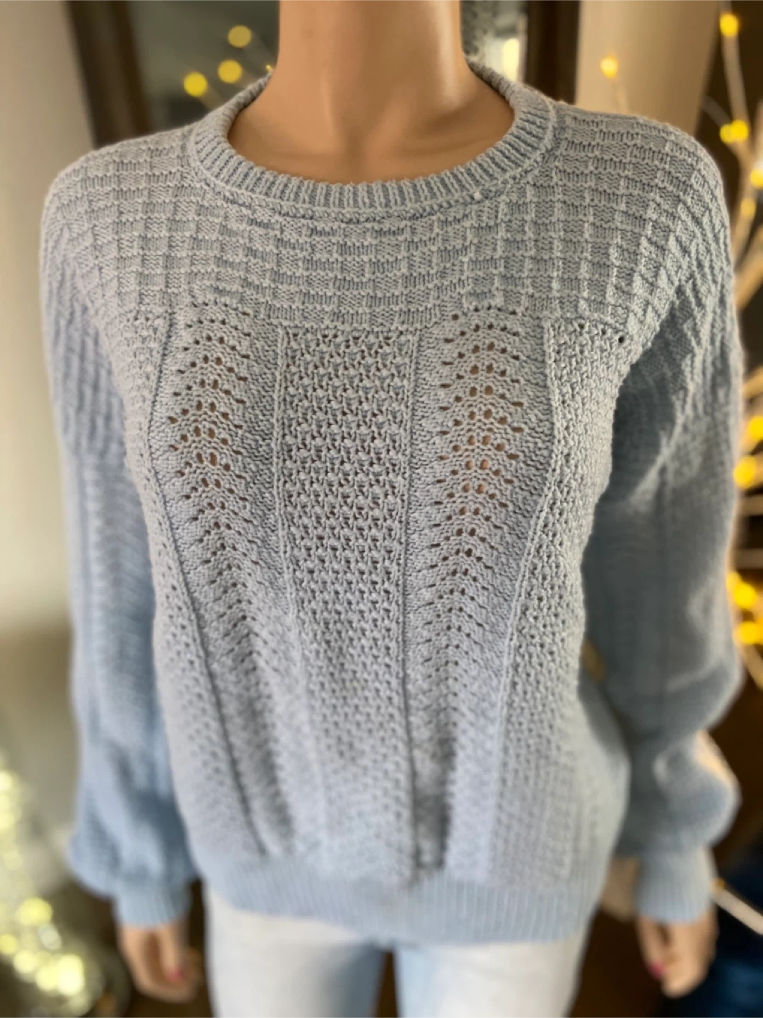 A cozy light blue hand-knitted pullover sweater with a delicate textured pattern. It features a classic crew neckline and long sleeves with cuffed wrists. This sweater's relaxed fit makes it a comfortable layering piece.