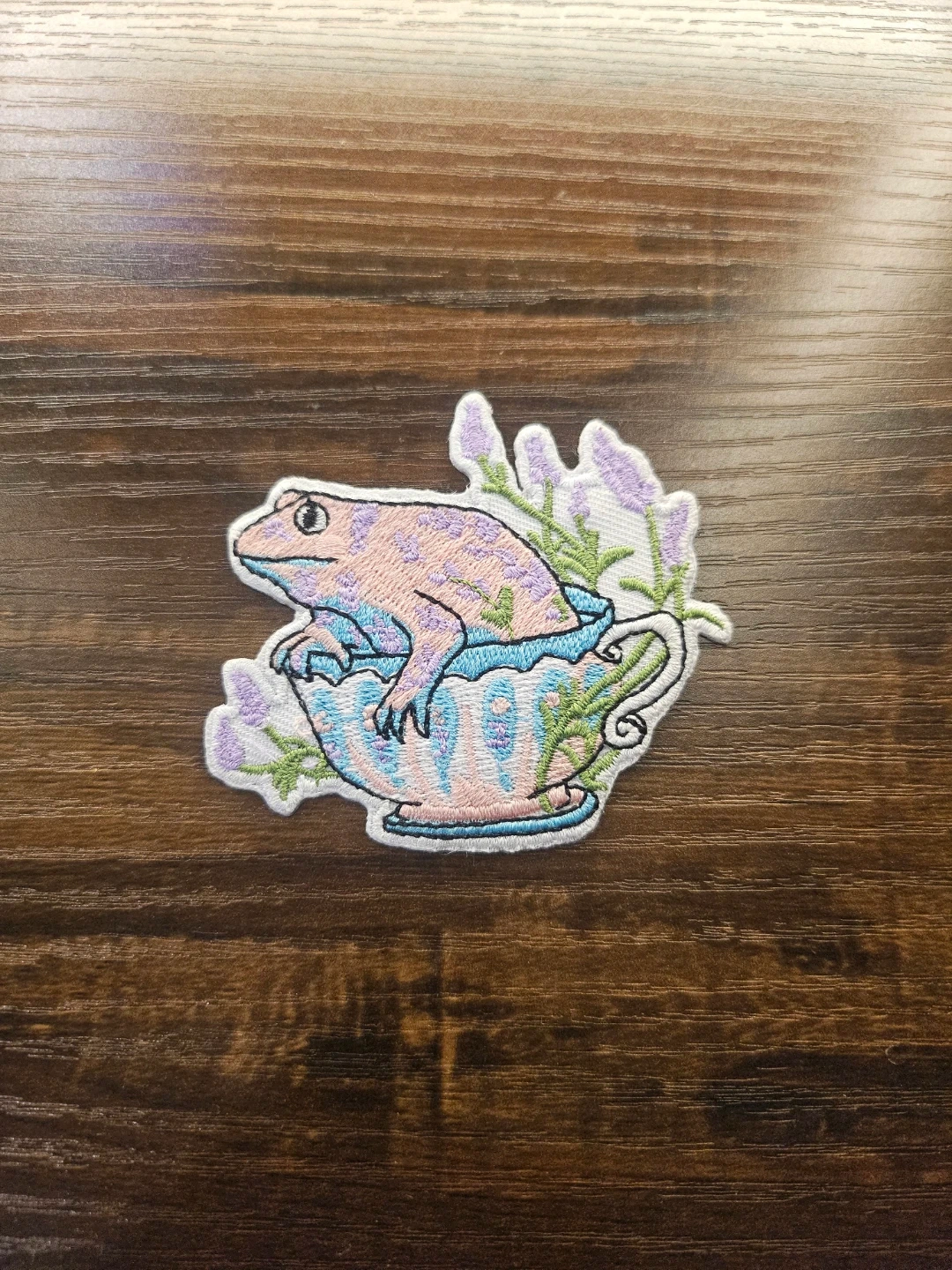 This is an embroidered patch featuring a cute frog sitting in a teacup with lavender sprigs. It's in great condition and ready to be sewn or ironed onto your favourite jacket, bag, or anything else you can think of!