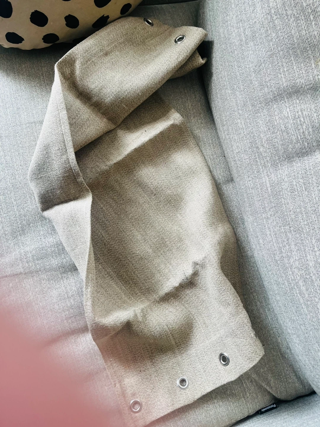 This is a hemp neutral-coloured fabric hammock for pets. It's made of a textured hemp linen-like material and features metal grommets along the each end for hanging. Never used - it’s still folded from packaging but easy to iron or hang to get the fold lines out.