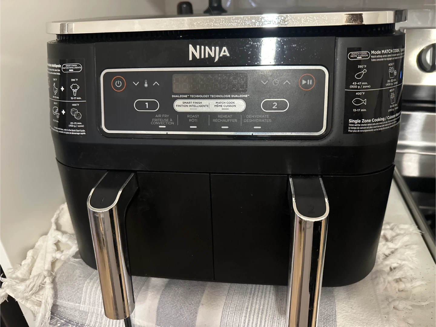 This Ninja DualZone air fryer features two independent cooking baskets. It offers multiple cooking functions including Air Fry, Roast, Reheat, and Dehydrate. The 'Match Cook' feature allows you to cook identical meals in both zones simultaneously.