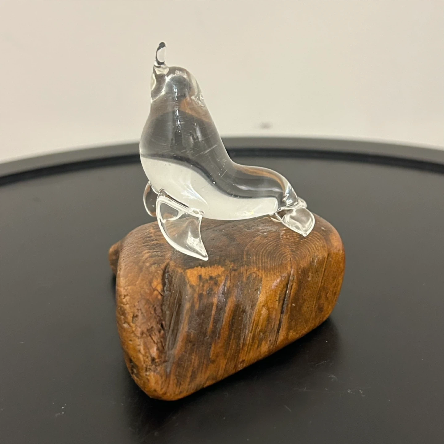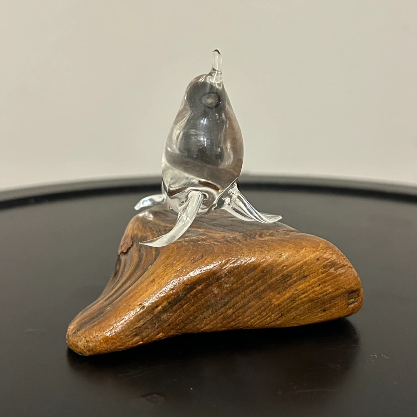 Bring a touch of coastal elegance to your home with this unique hand-blown glass seal. The crystal-clear glass sculpture is gracefully arched and mounted on a beautifully textured natural wood base, reminiscent of driftwood.