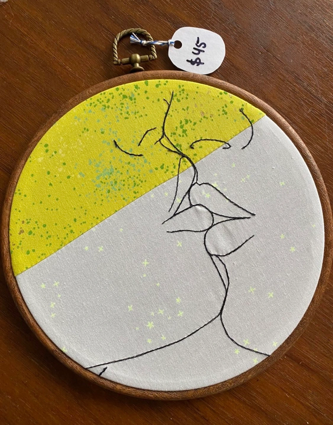 Queer art needle point with dual toned fabric that outlines two women kissing.