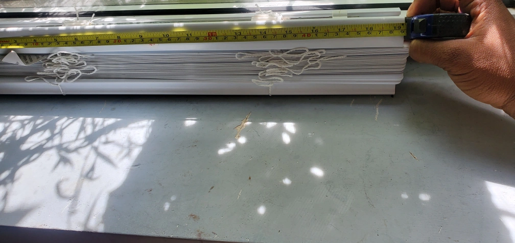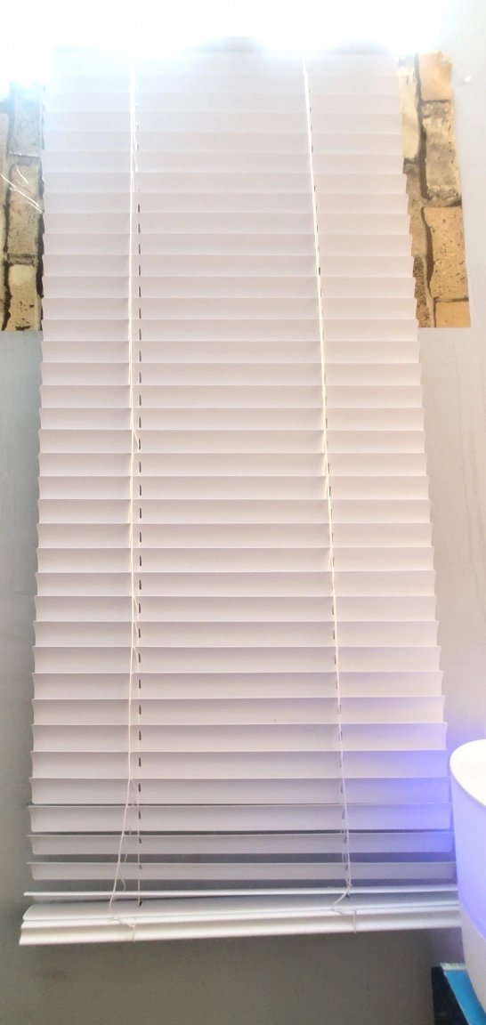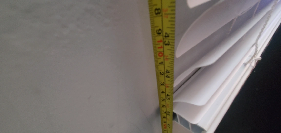 Standard white window blinds, retractable and had an open close shade, I've misplaced the turner but that an easy DIY fix. I tired to give it an accurate measure as possible in the pictures but you can re-measure it if you're interested in buying.