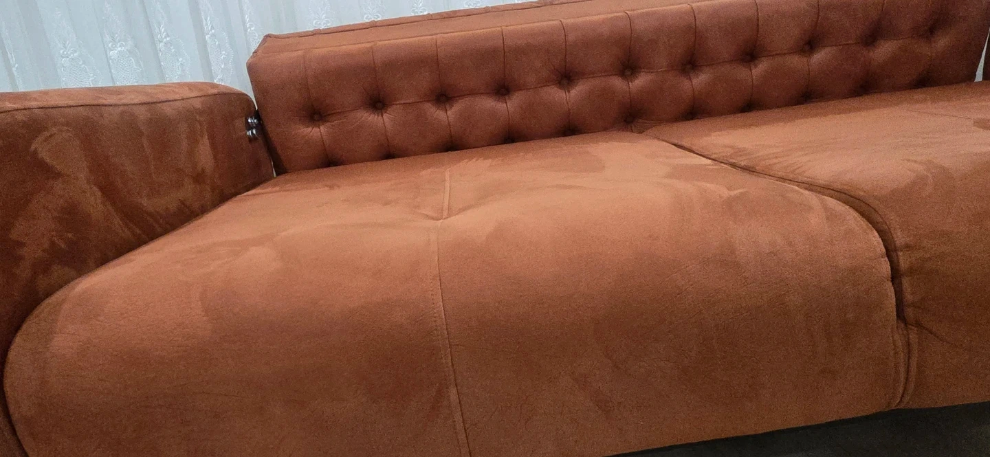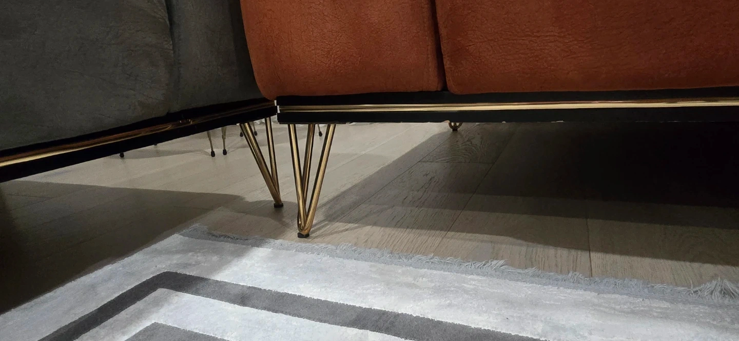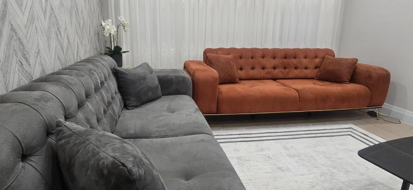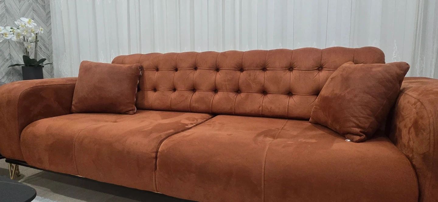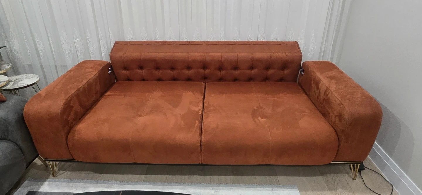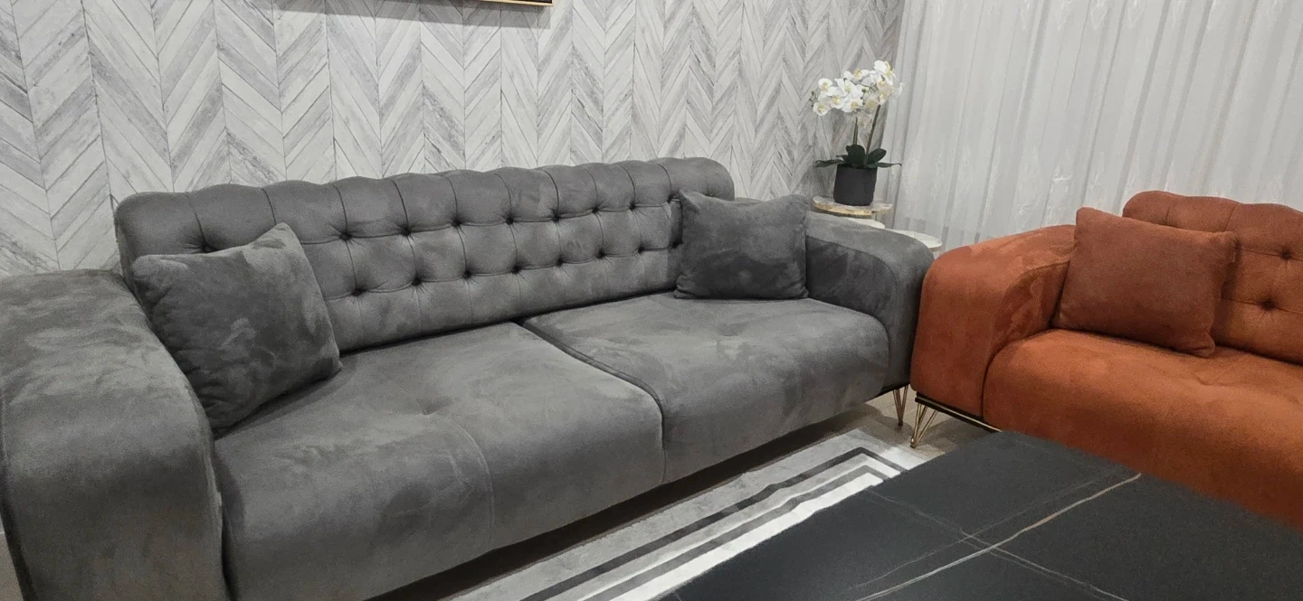 Selling a lovely 2 set sofa! It's in great shape and would look perfect in any living room. The sofa has a tufted design and stylish gold legs.