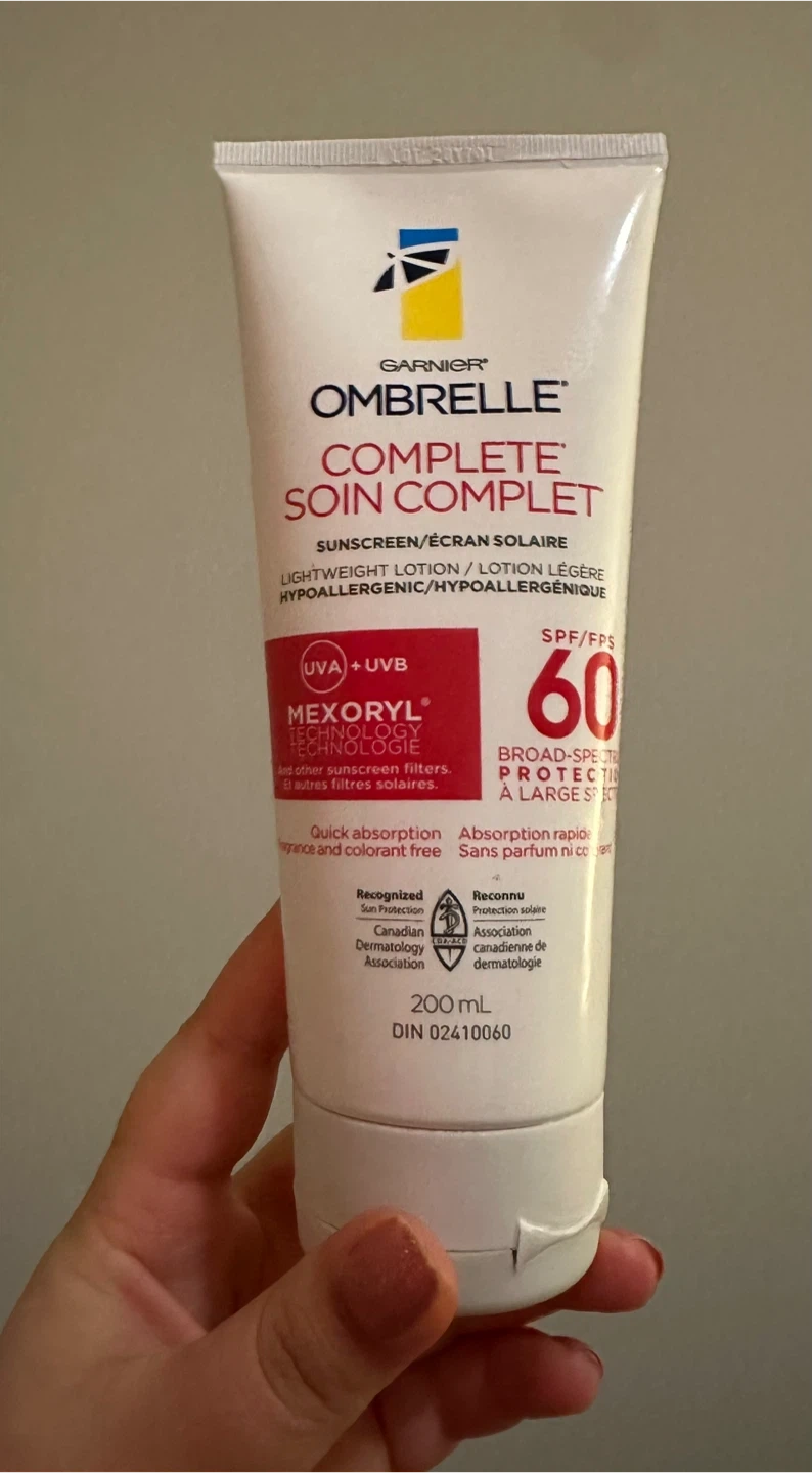 Garnier Ombrelle Complete Sunscreen Lotion with SPF 60. It's a lightweight, hypoallergenic formula with Mexoryl technology for broad-spectrum UVA/UVB protection. Quick absorption and fragrance-free. 200 mL bottle.