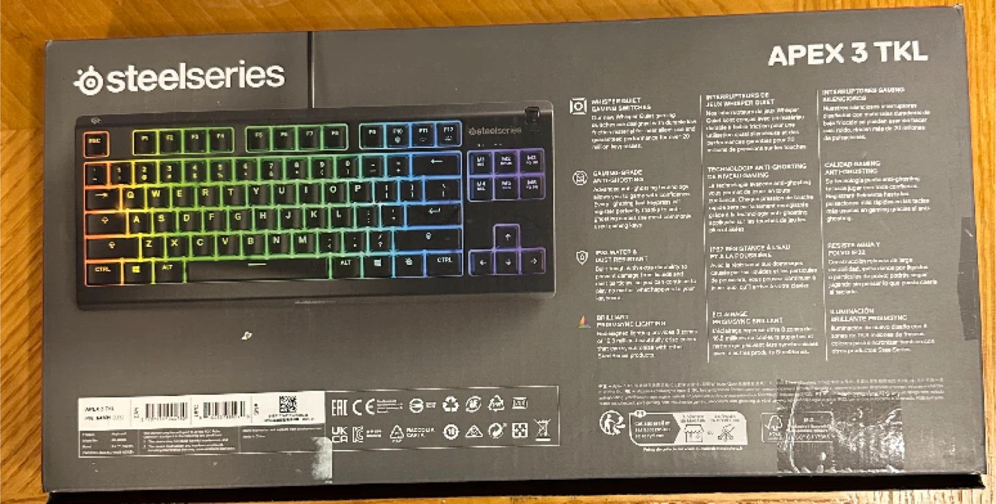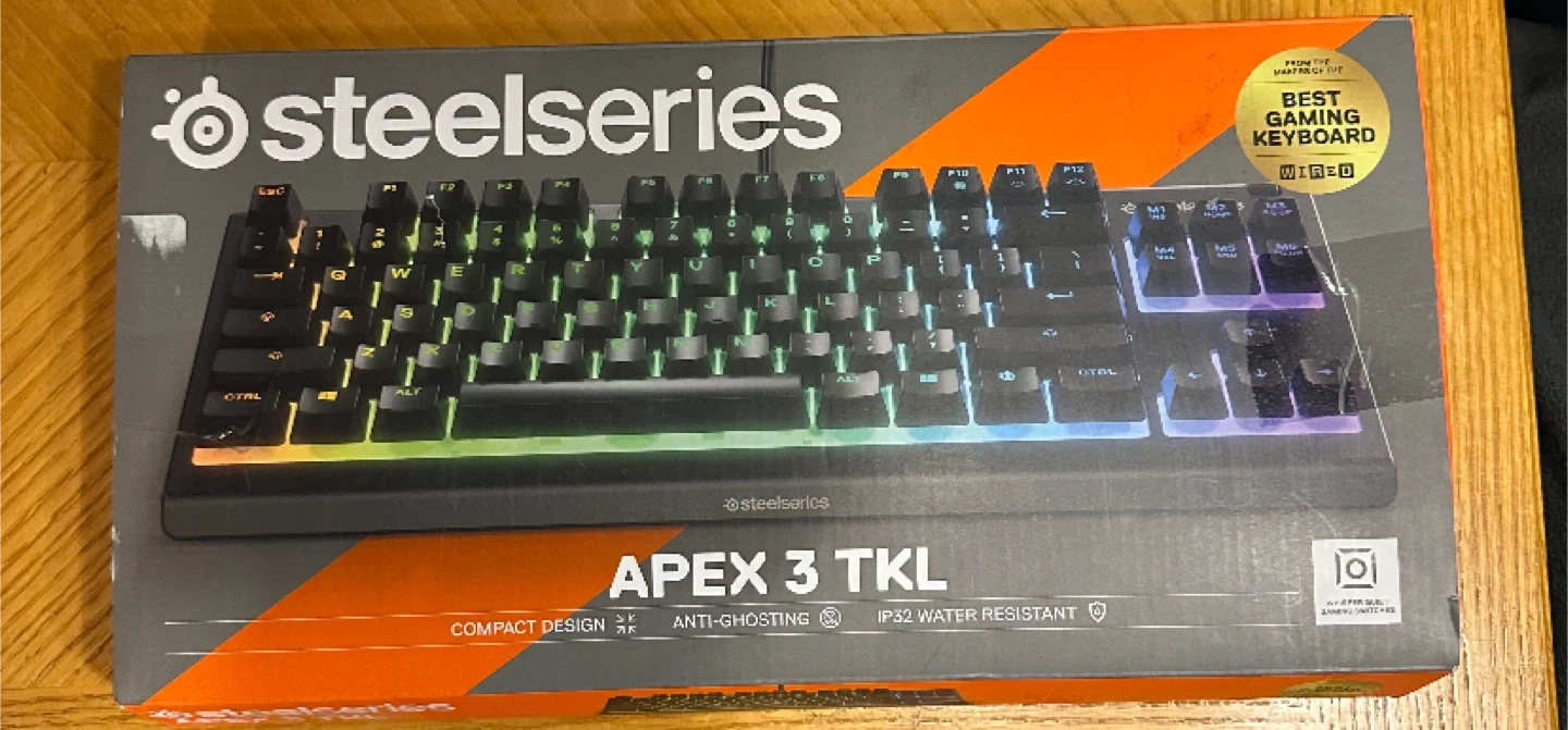 This is the SteelSeries Apex 3 TKL keyboard. It's a compact, tenkeyless design. The keyboard is IP32 water-resistant and features anti-ghosting.
