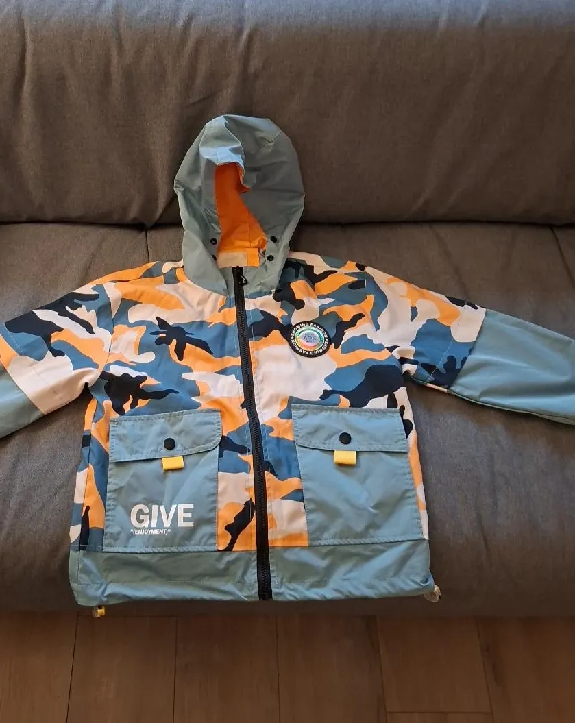 This is a kids' hooded jacket with a cool camouflage pattern. It features a full zip-up front and two chest pockets with flap closures. The jacket has a contrasting light blue hood and sleeves.