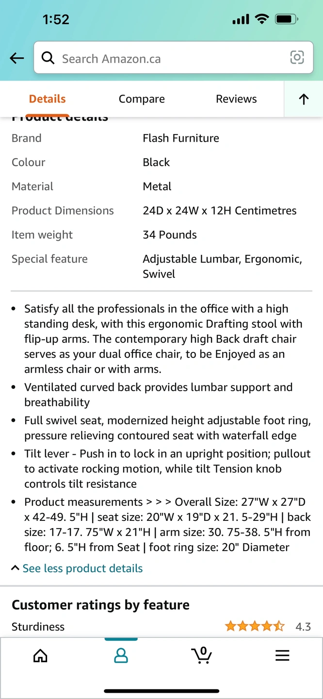 Product measurements > > > Overall Size: 27"W x 27"D x 42-49. 5"H | seat size: 20"W x 19"D x 21. 5-29"H | back size: 17-17. 75"W x 21"H | arm size: 30. 75-38. 5"H from floor; 6. 5"H from Seat | foot ring size: 20" Diameter