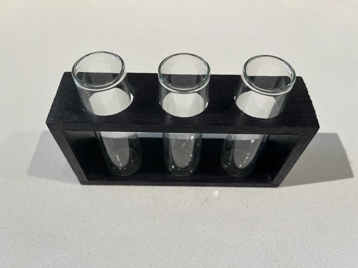3 tube-like vases in a wooden holder