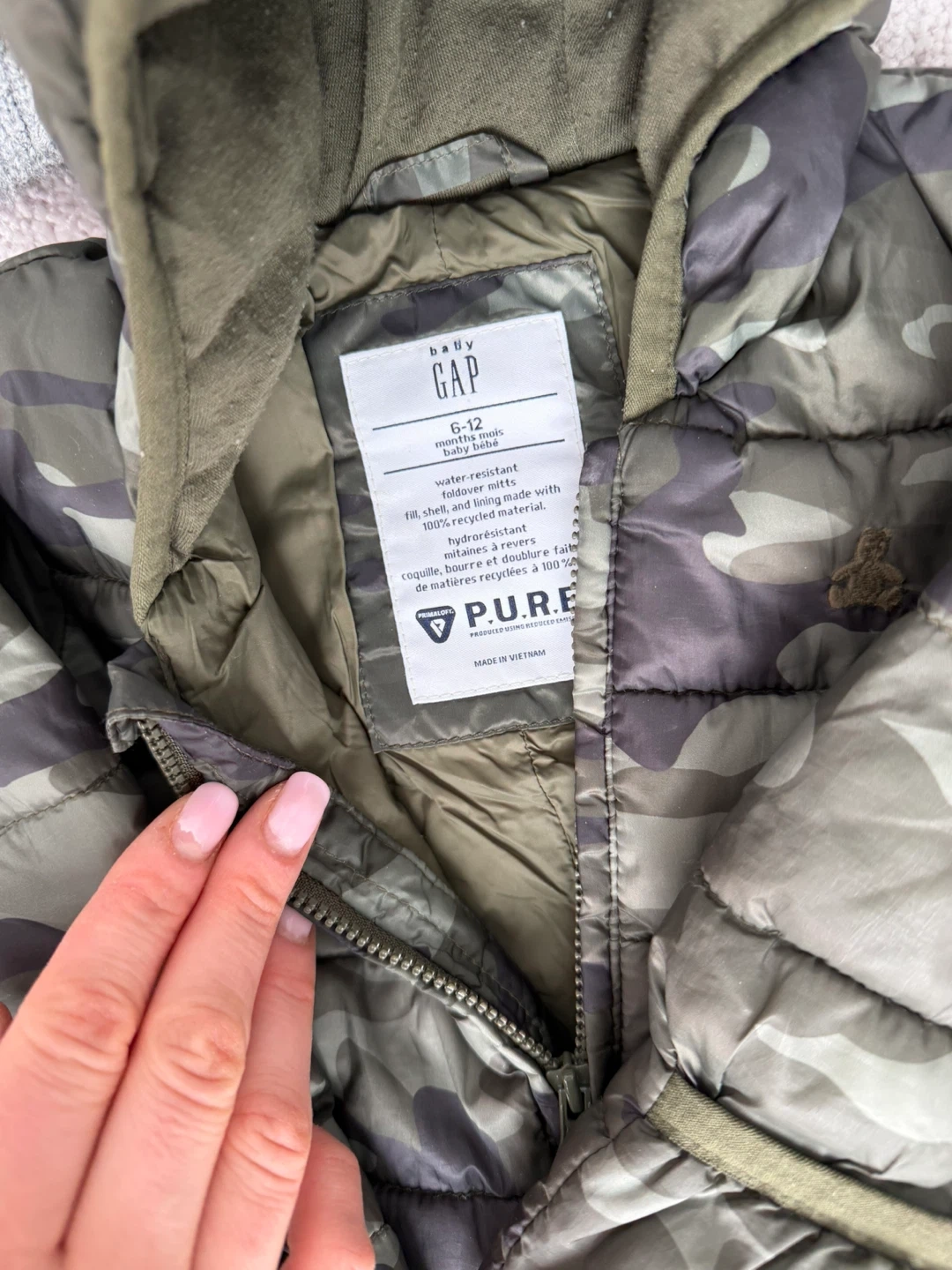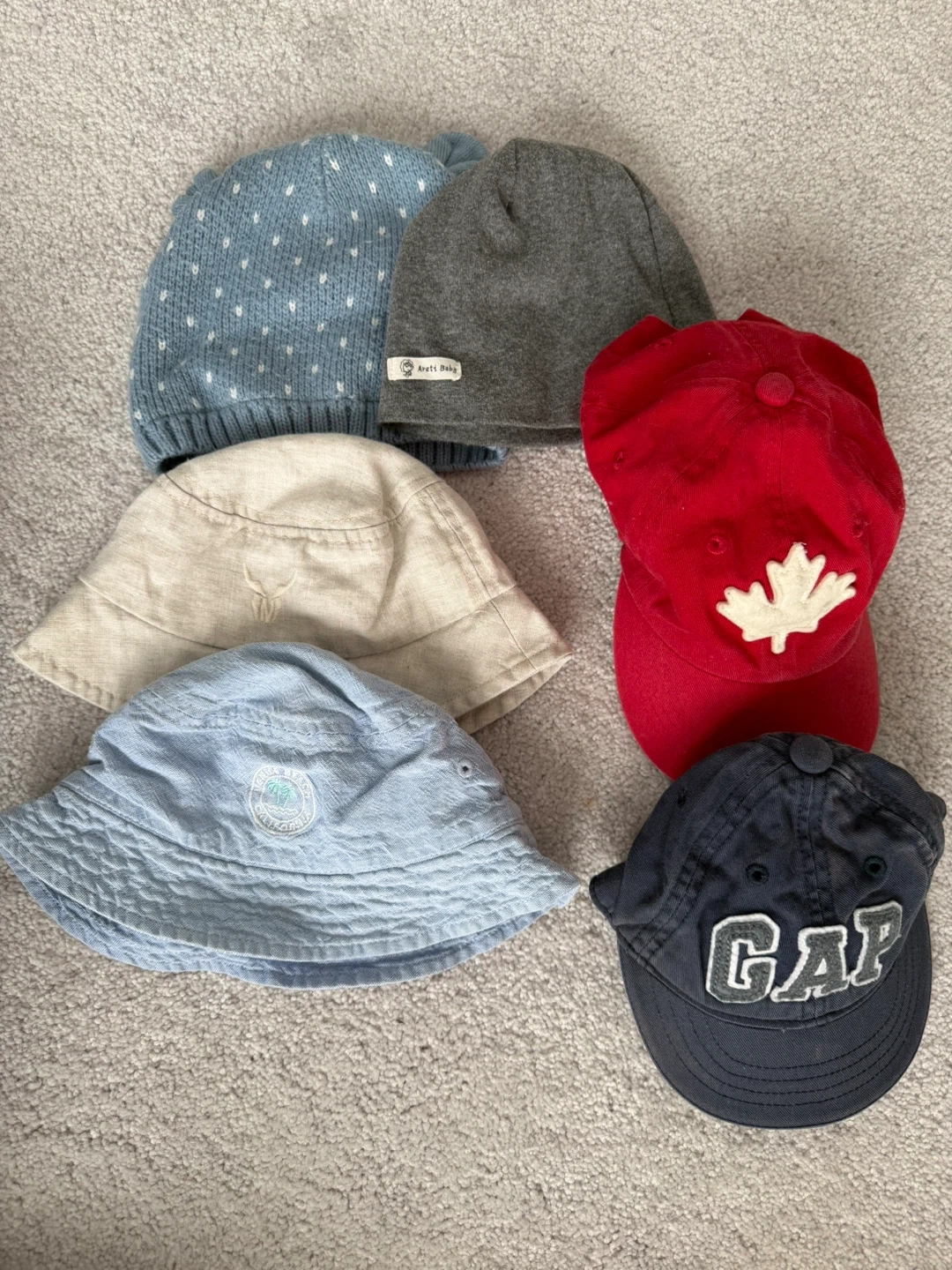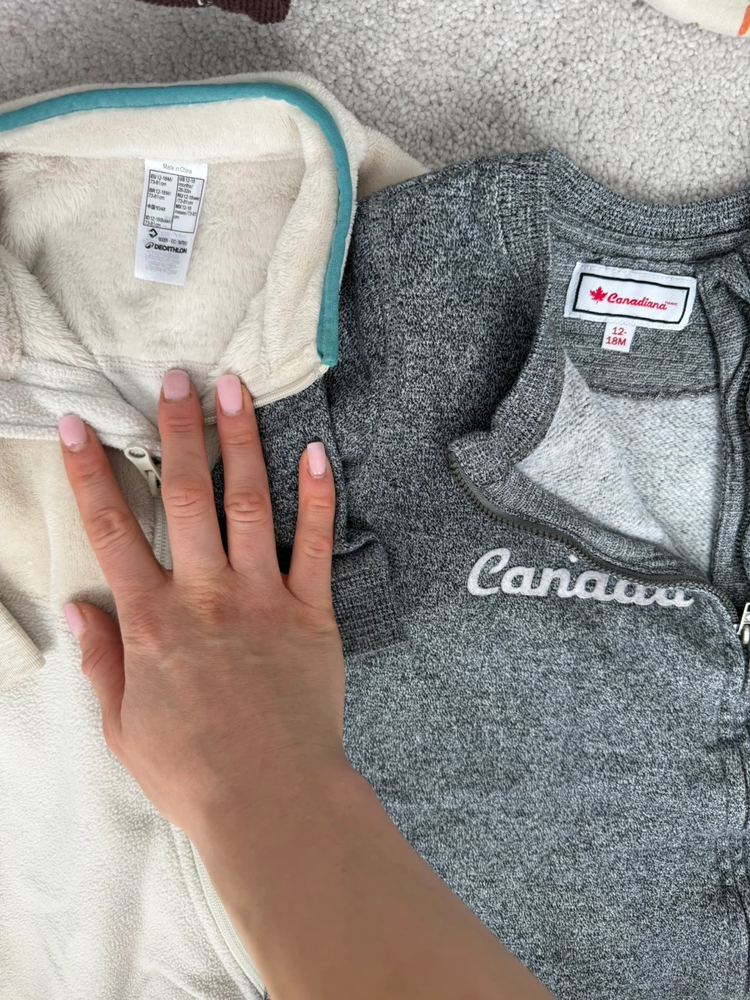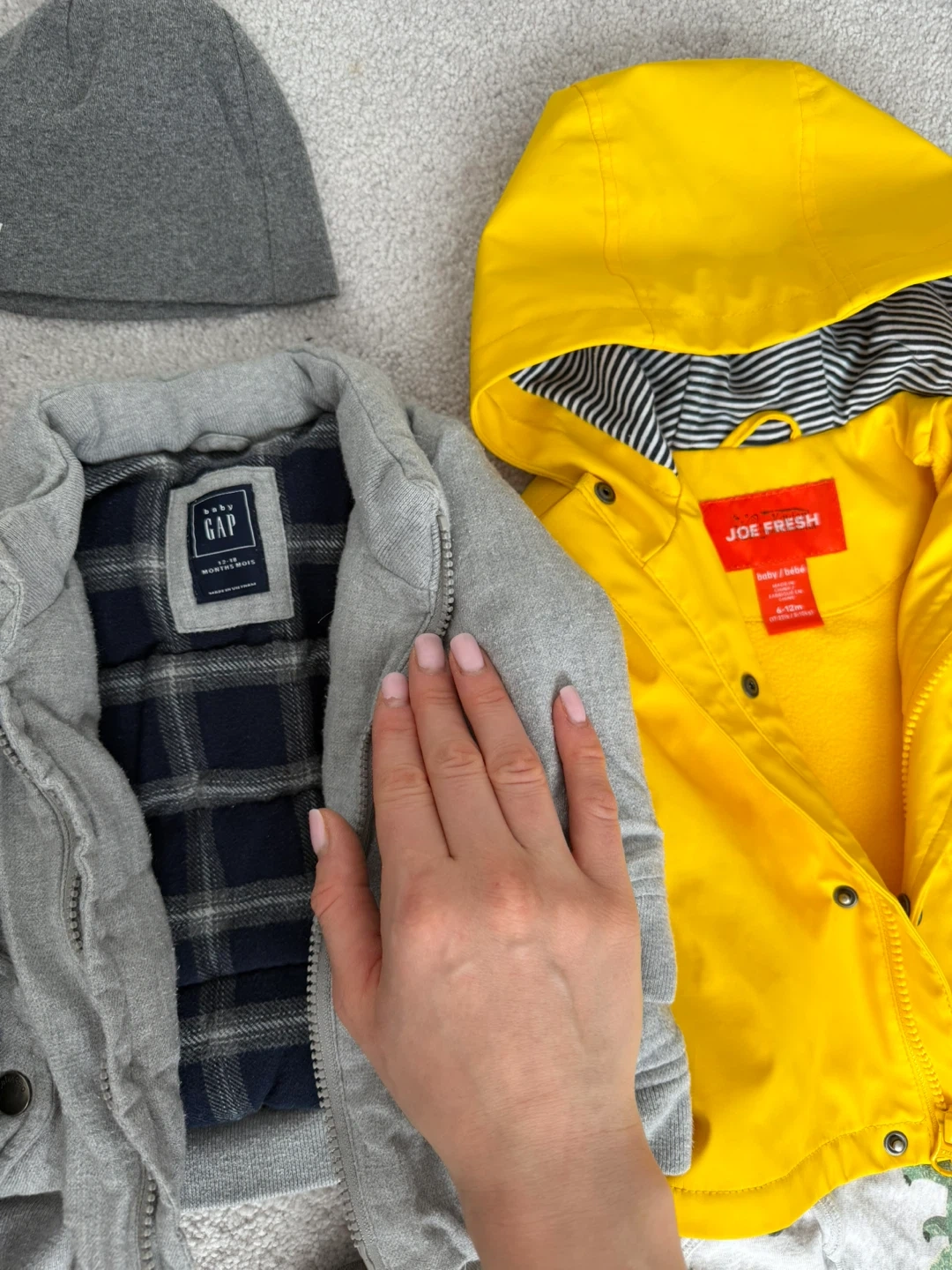 A collection of baby clothes including onesies, sleepers, jackets, and hats from various popular brands. All items are size 12-18 months. Includes a GAP puffer jacket, Joe Fresh rain jacket, Old Navy fleece jacket, and more.