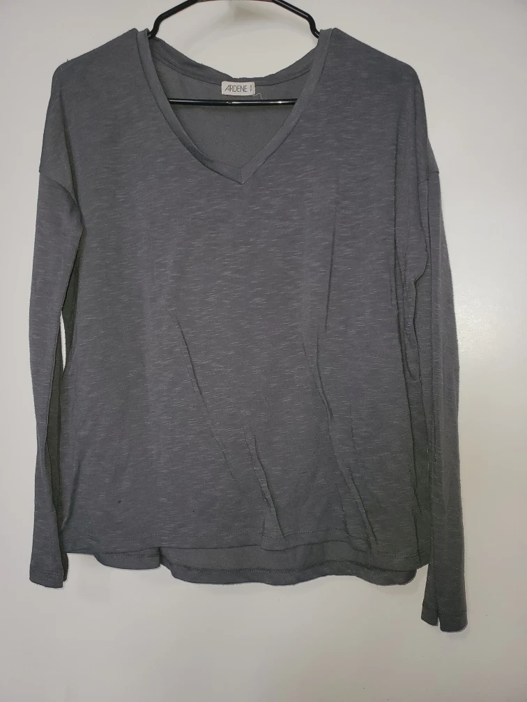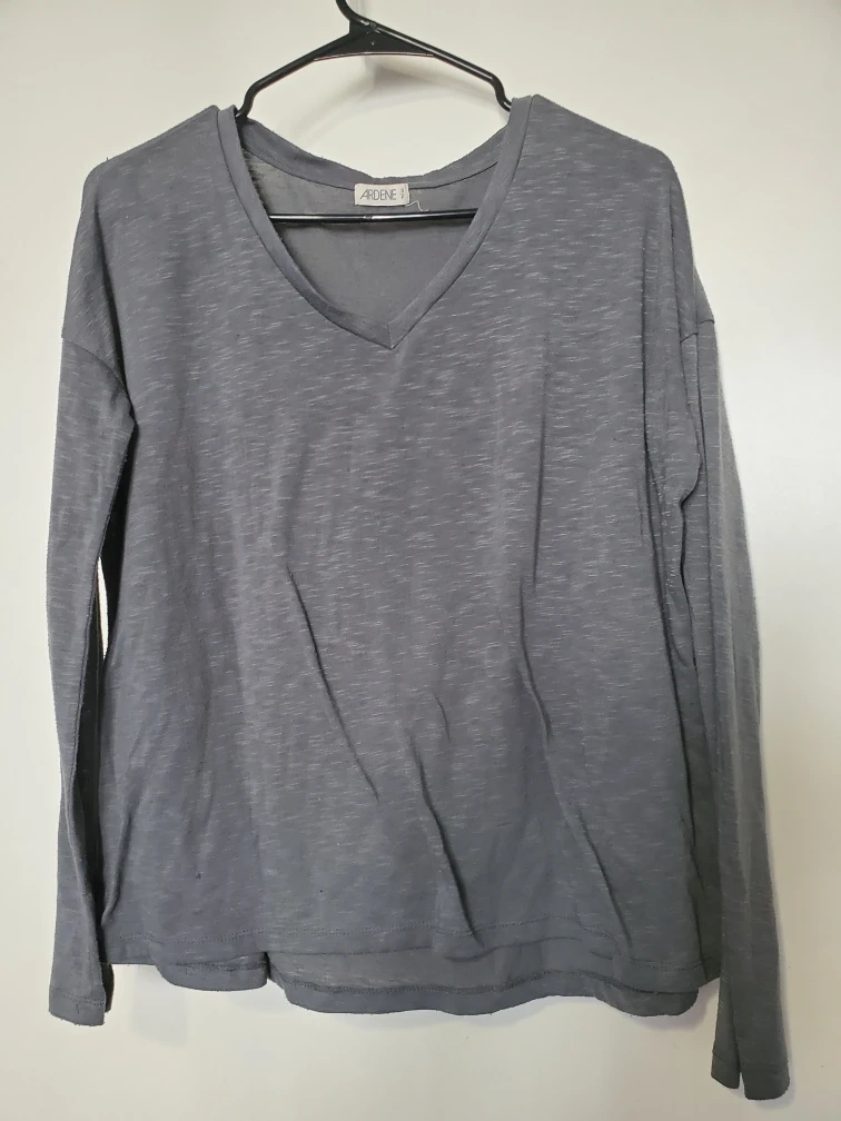 1 Grey long sleeve V-neck top. Used clothing item. Loose fit.