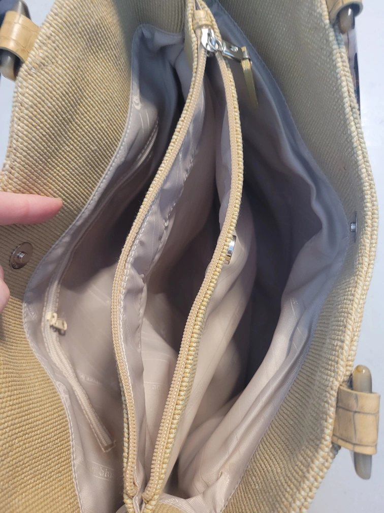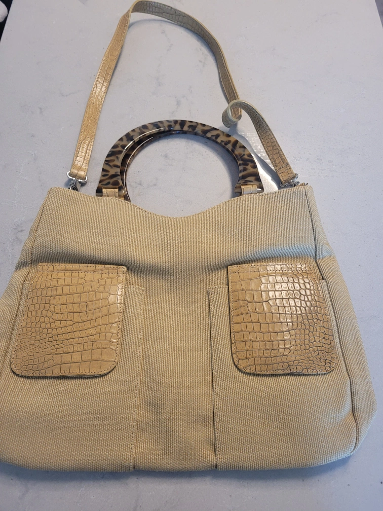 Tote with secure exterior and interior pockets. Comes with a removable long strap. Great for travel.