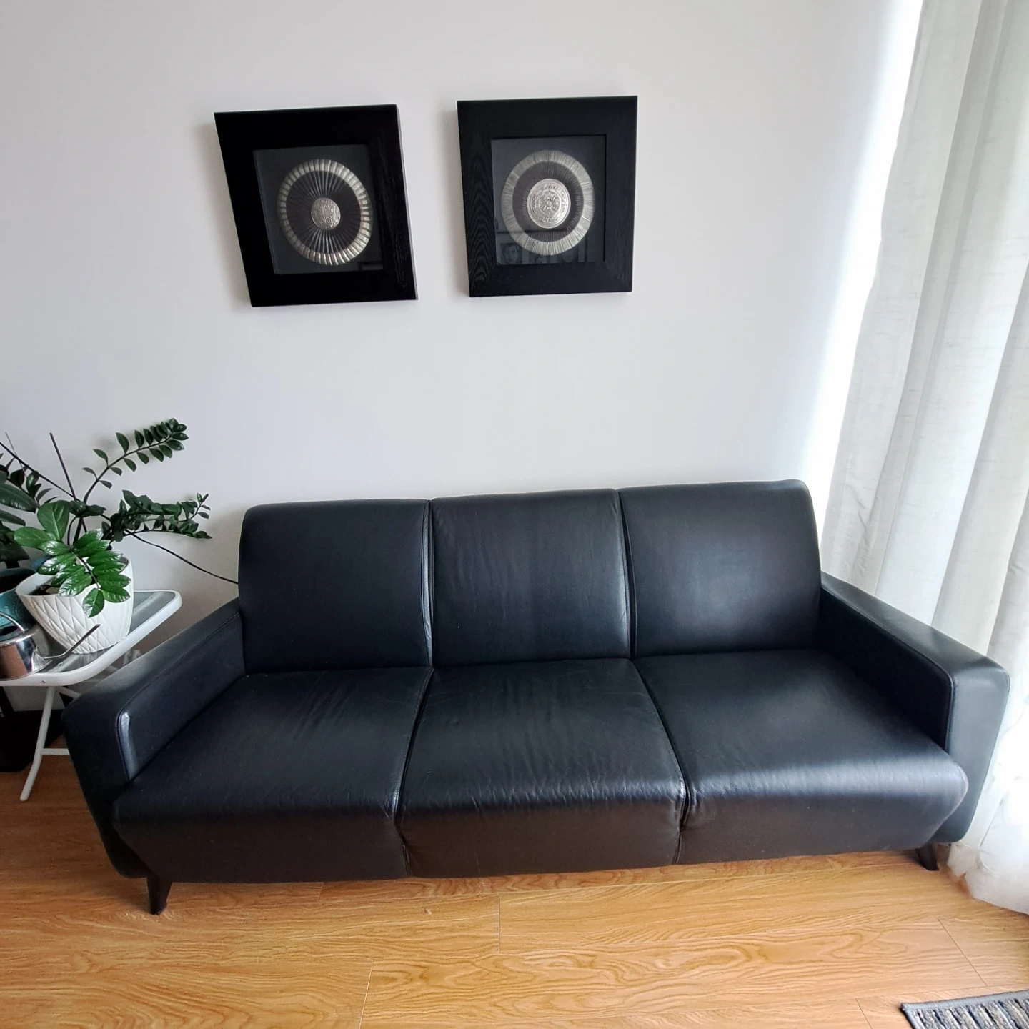 This is a three-seater black leather sofa. It's a sleek addition to any living space. Its classic design fits well with various decor styles.