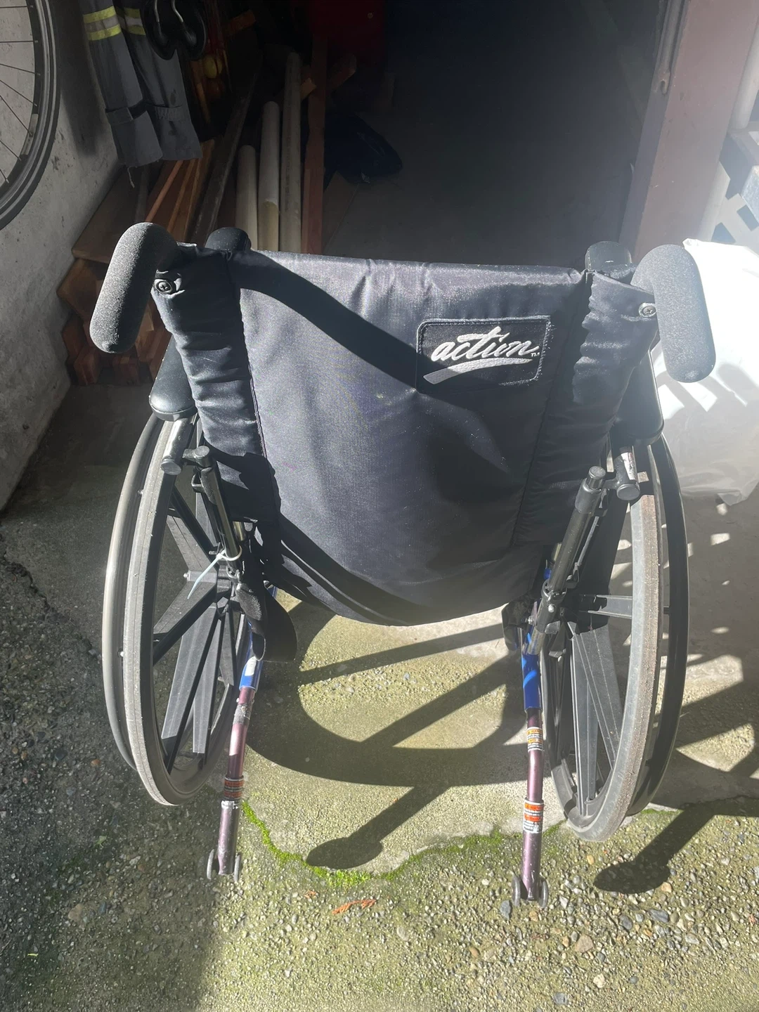 This is an Action brand lightweight wheelchair with a blue frame. It includes a green seat cushion for added comfort. It's great for easy transport and mobility.