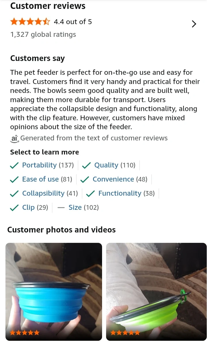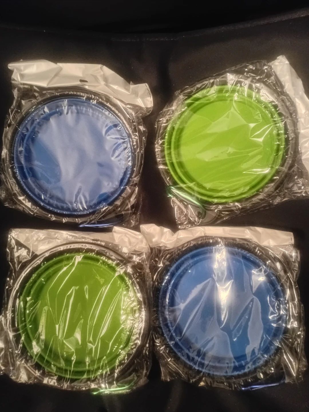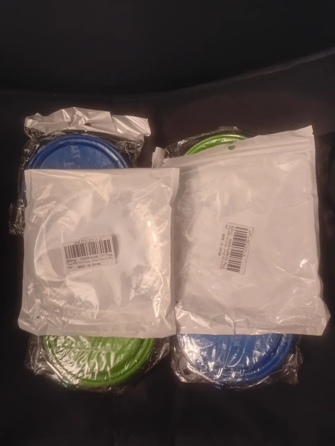 This is a two-pack of Piepea collapsible dog bowls. They're made of food-grade silicone and are BPA-free. Each bowl measures 5.1 inches in diameter when expanded and 2.1 inches in height. This makes them super handy for travel with your furry friend!