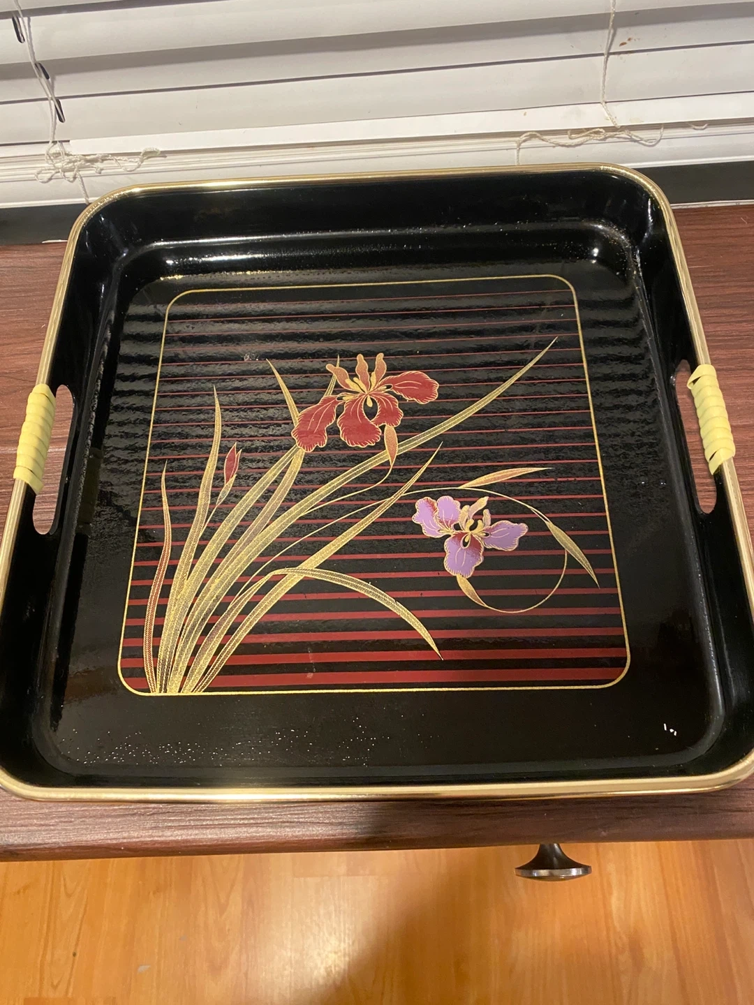 Elevate your serving or display game with the vintage charm of this 3-piece Black Lacquer Iris nesting tray set.