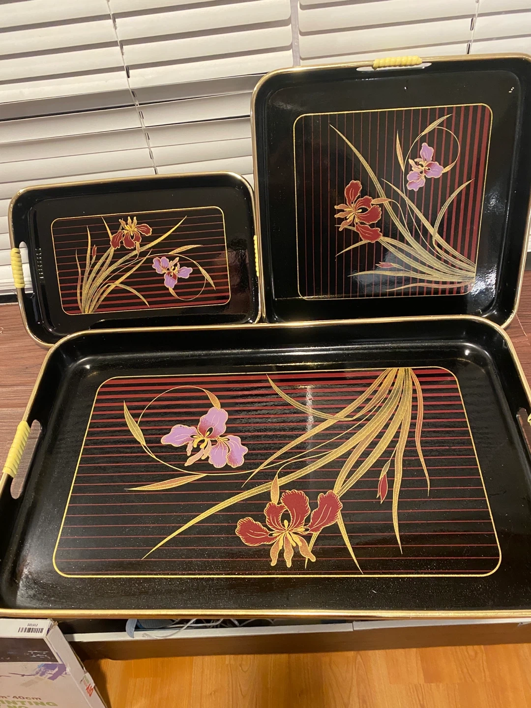 3 Pcs Vintage Japan Black Lacquerware Tray Set