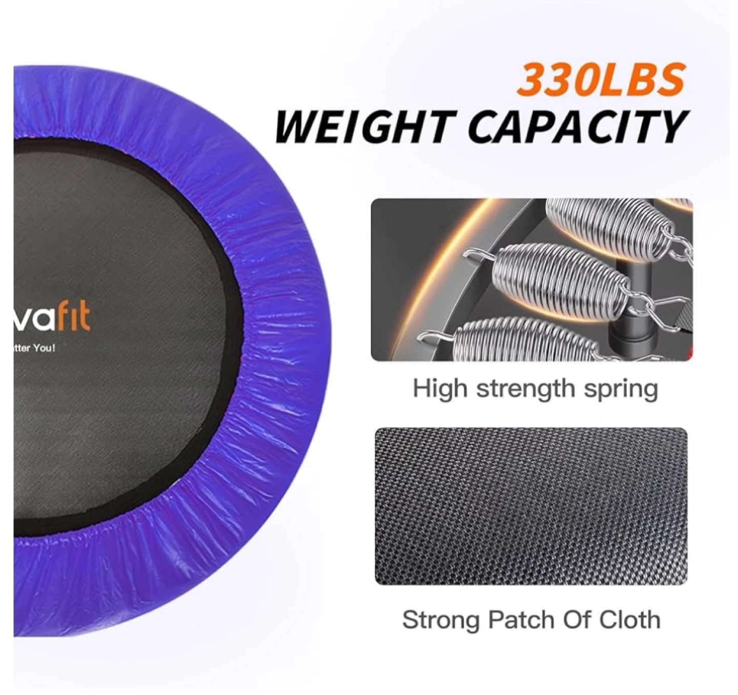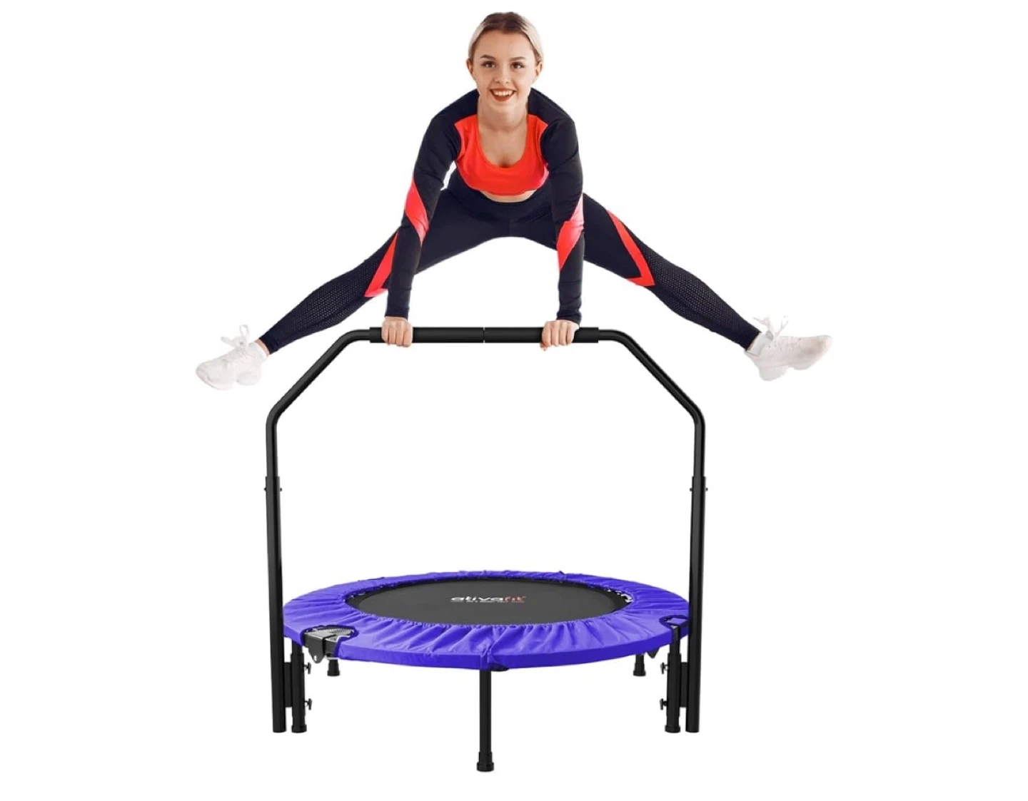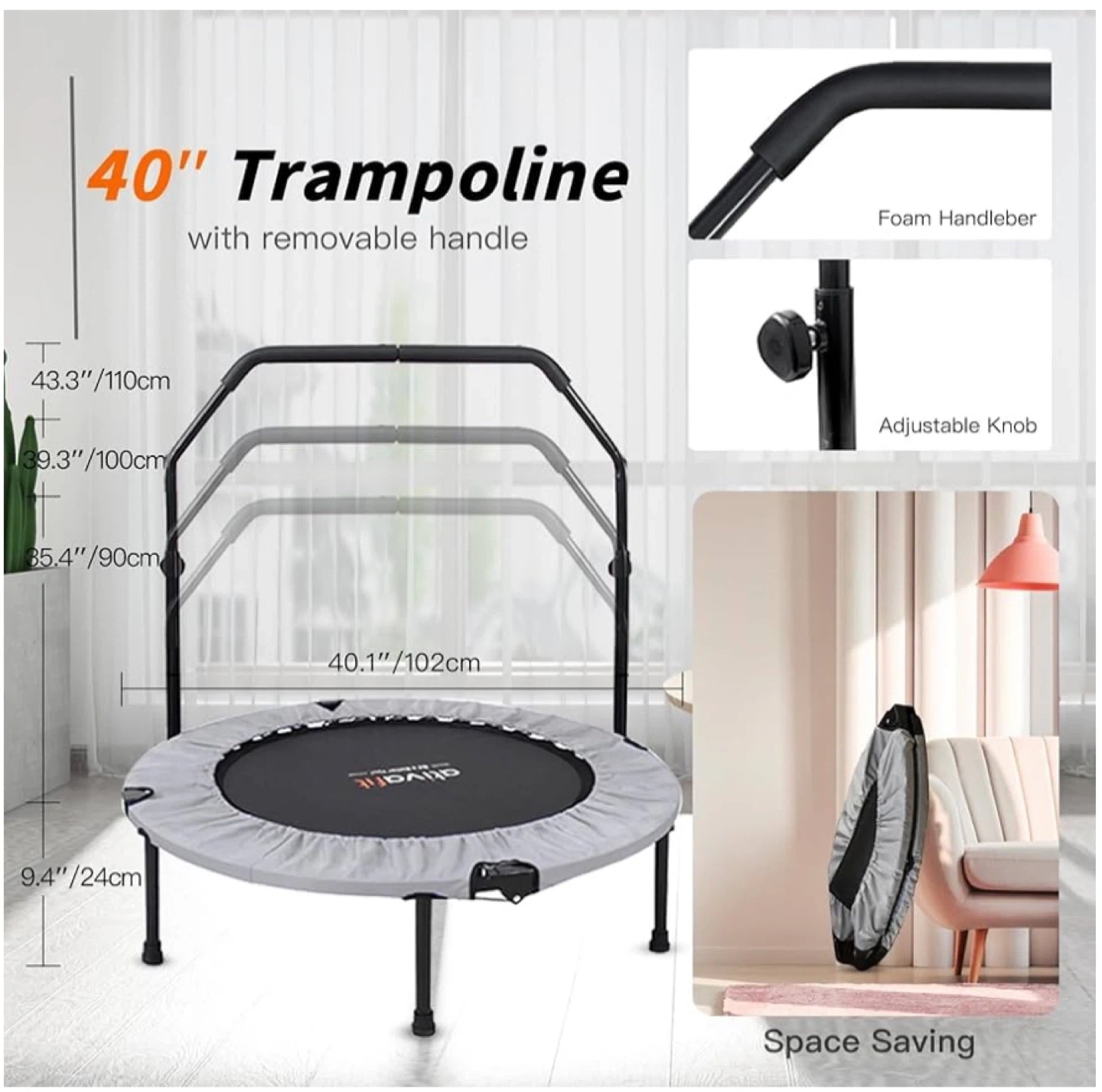 This 40" trampoline has a weight capacity of 330 lbs. It features high-strength springs and a foam handlebar with an adjustable knob. It's also space-saving for easy storage. This trampoline is useful for home workouts.