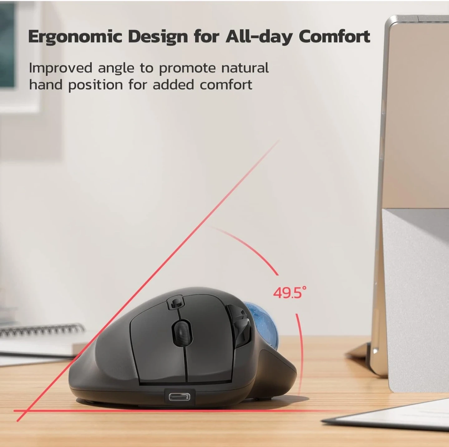 This Nulea M5 wireless trackball mouse is designed for comfort and precision. It features a rechargeable built-in battery offering up to 21 days of use on a full charge. Move your cursor with the smooth trackball to free your wrist and arm from pain.