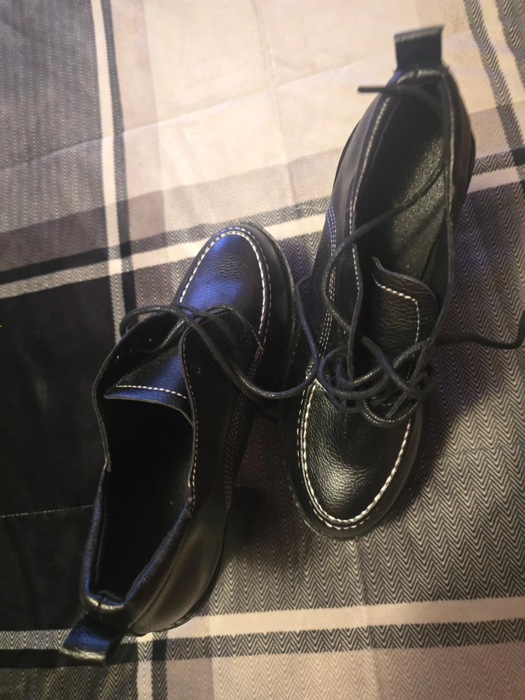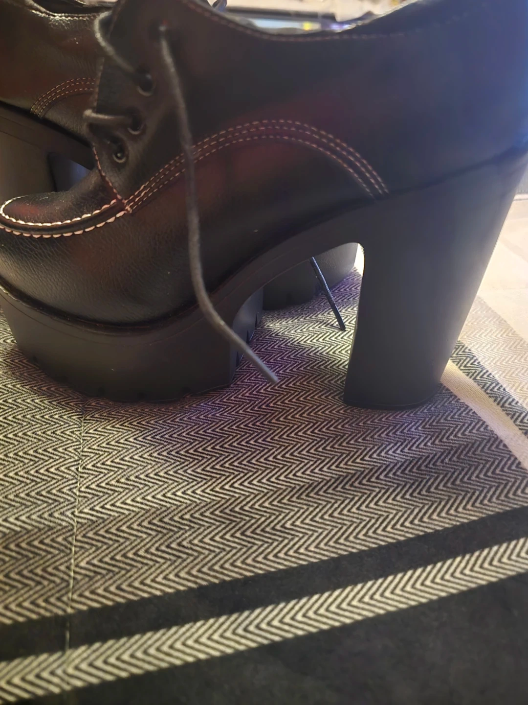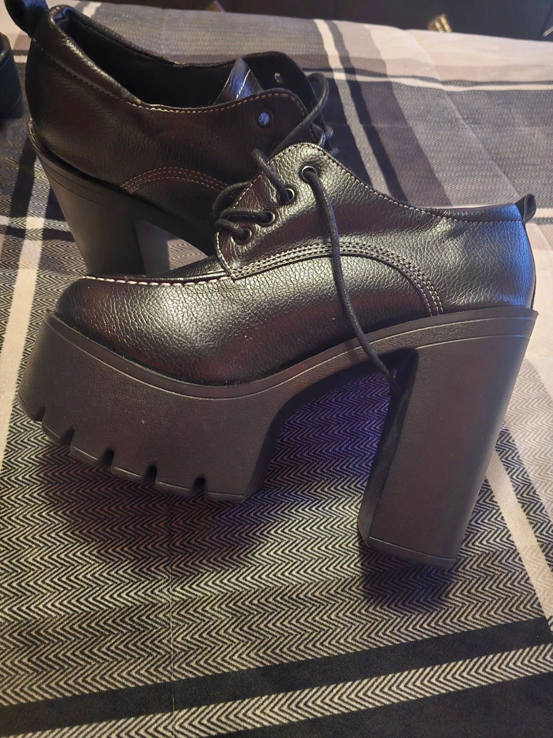 Black faux leather platform heeled shoes with white contrast stitching. Features a lace-up closure and a thick lug sole. Heel height approximately 4 inches.
