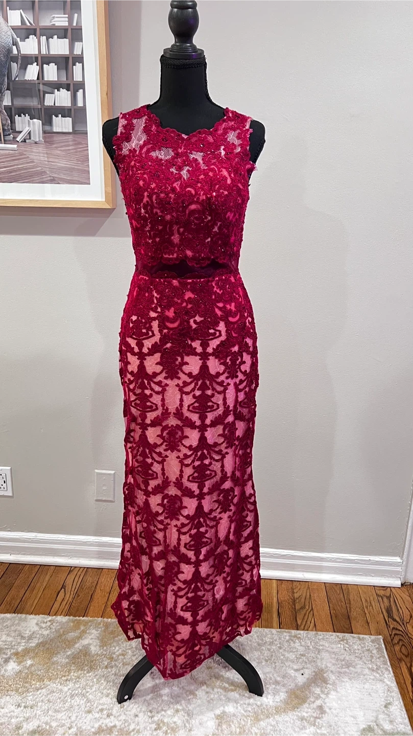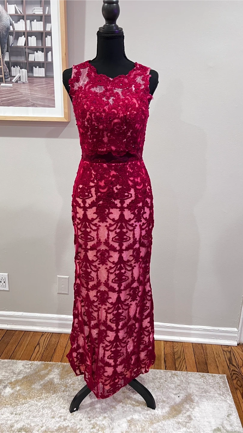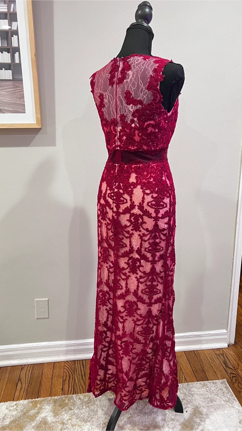 Selling a beautiful Cinderella Divine formal dress in size 8. It features a stunning maroon lace overlay and a flattering silhouette. Perfect for a special occasion!