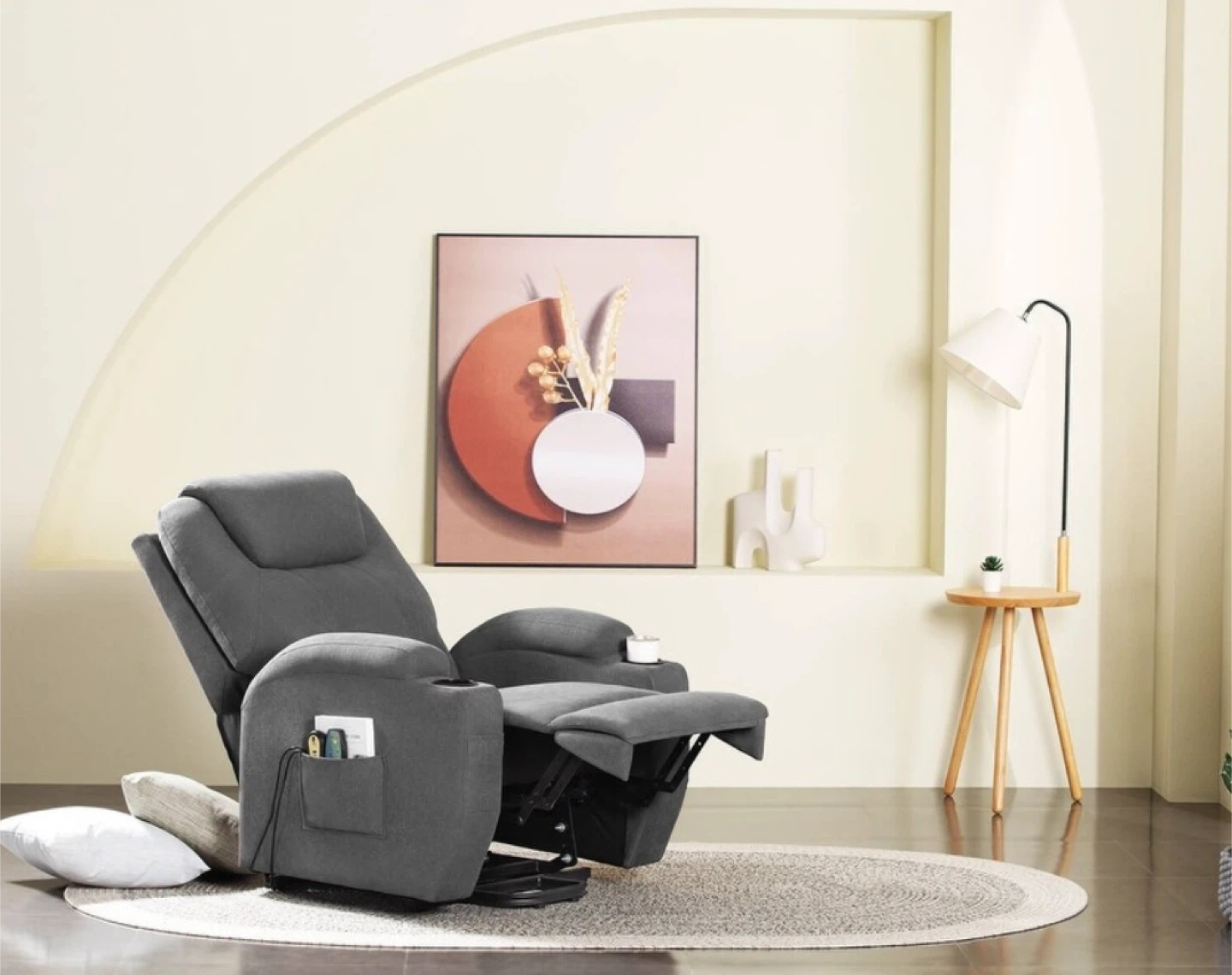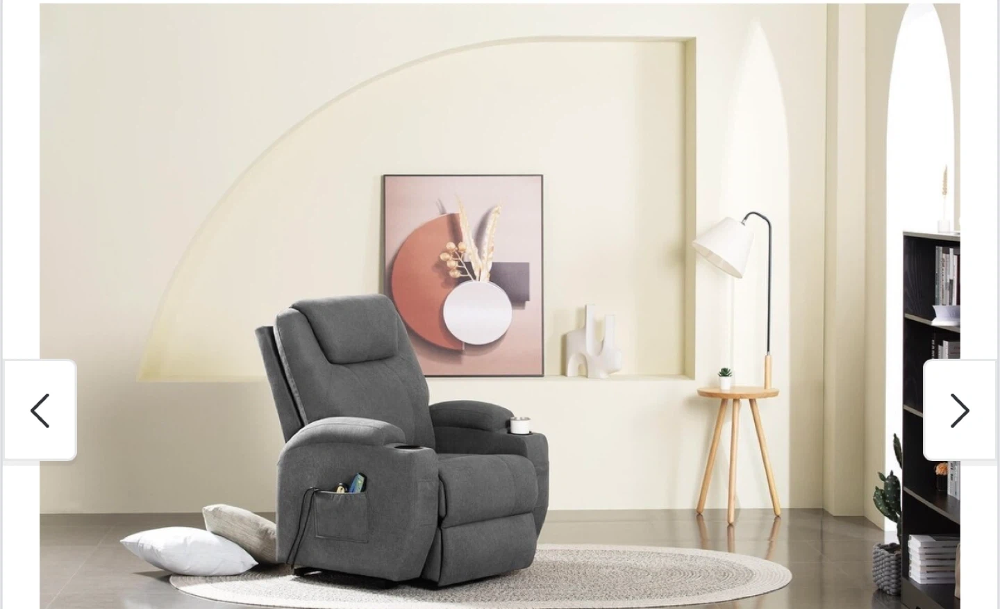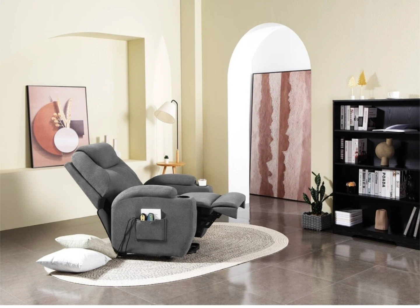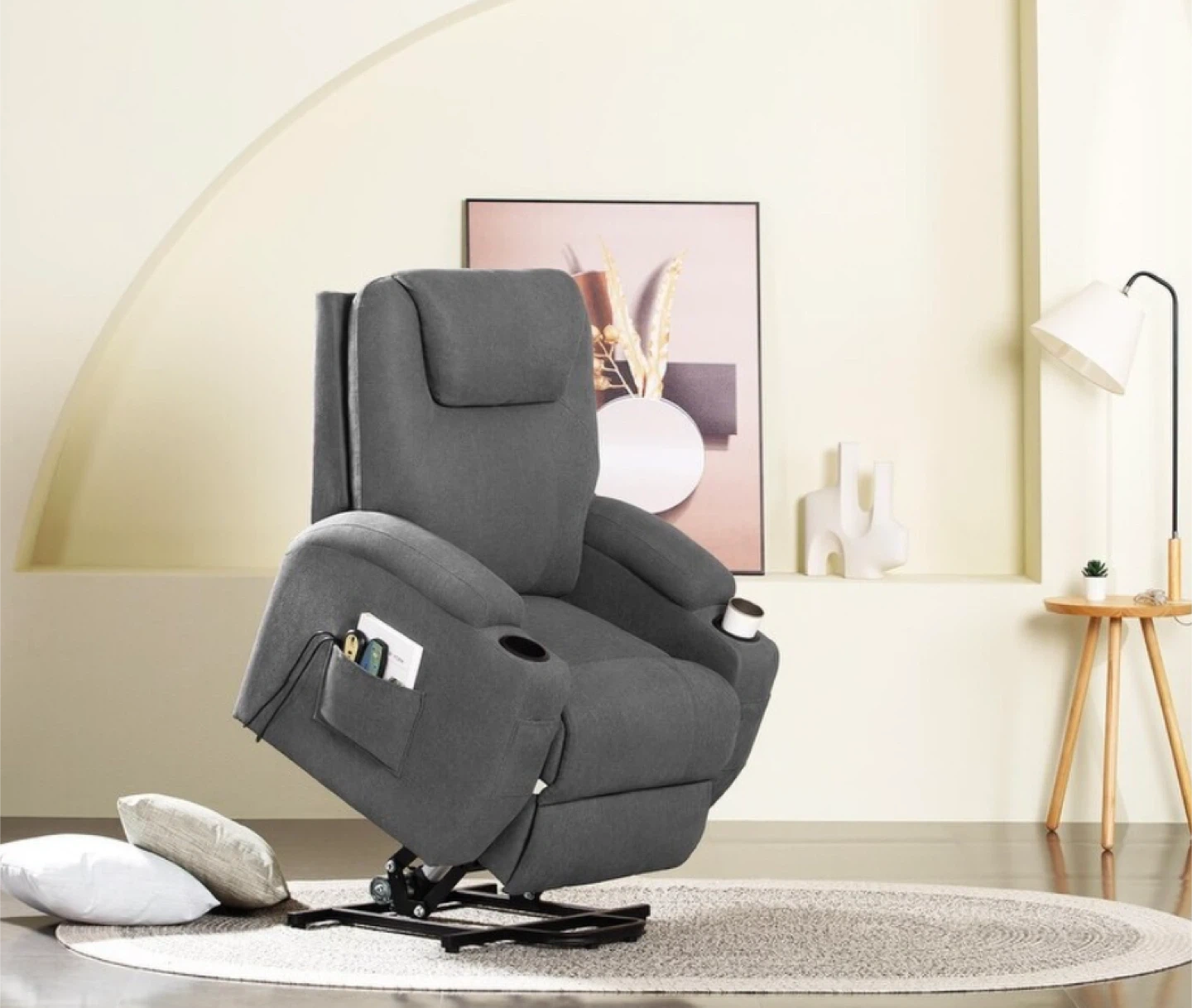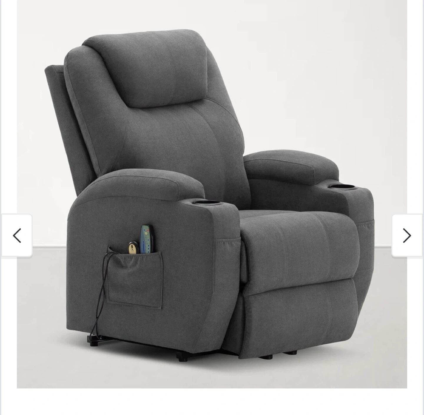 This is a grey fabric electric power lift recliner chair. It features a cup holder and a side pocket for storage. Perfect for relaxing after a long day!