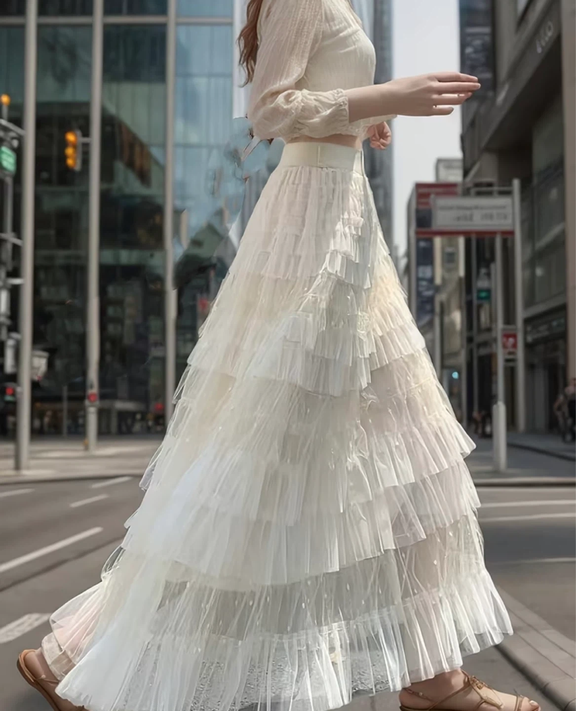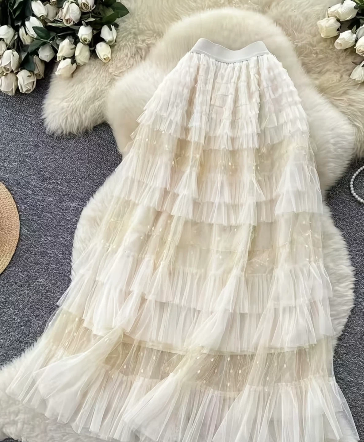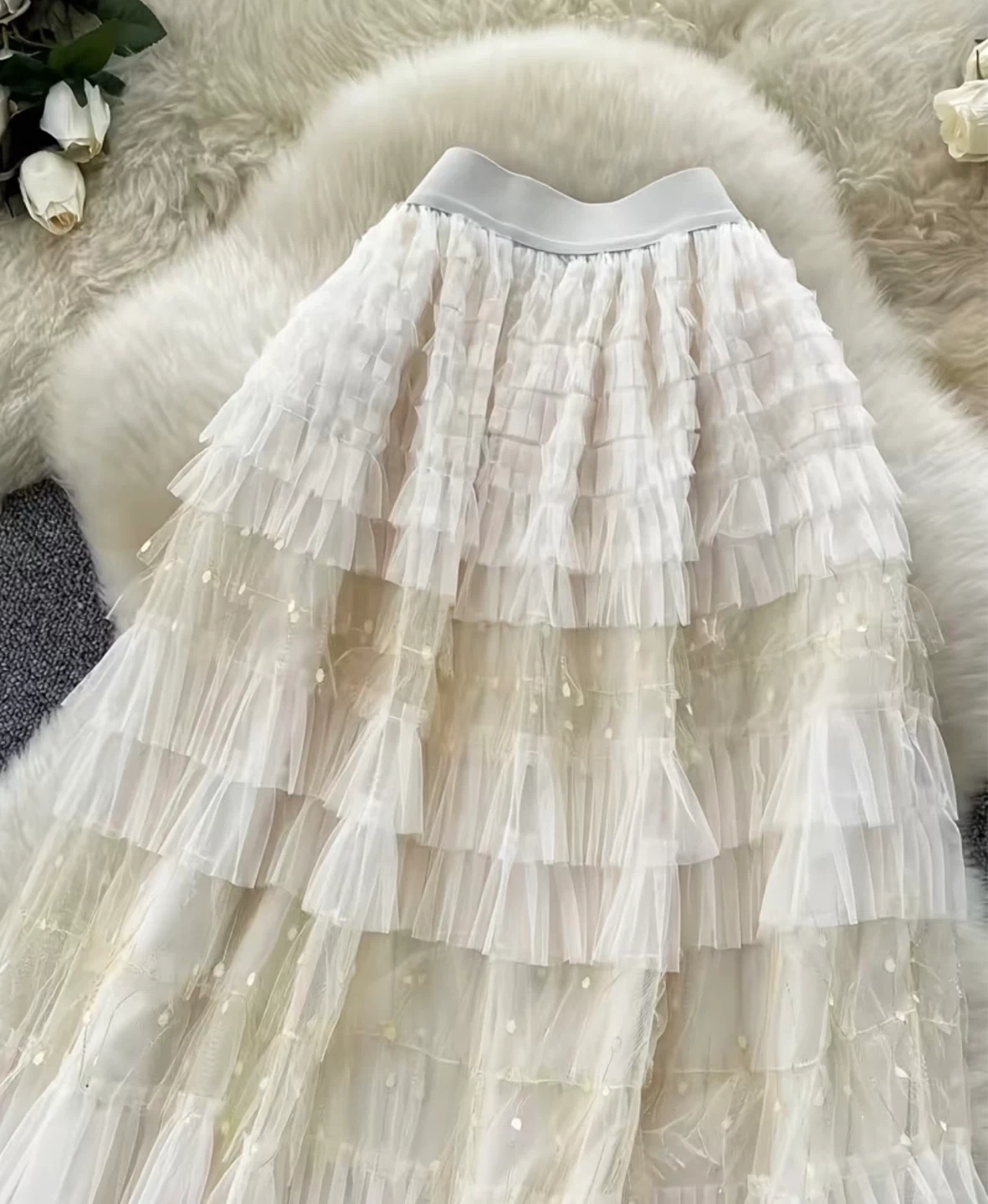 Beautiful tiered maxi skirt with ruffles. It's made of sheer tulle fabric with a cream satin waistband and hem. Sheer material!