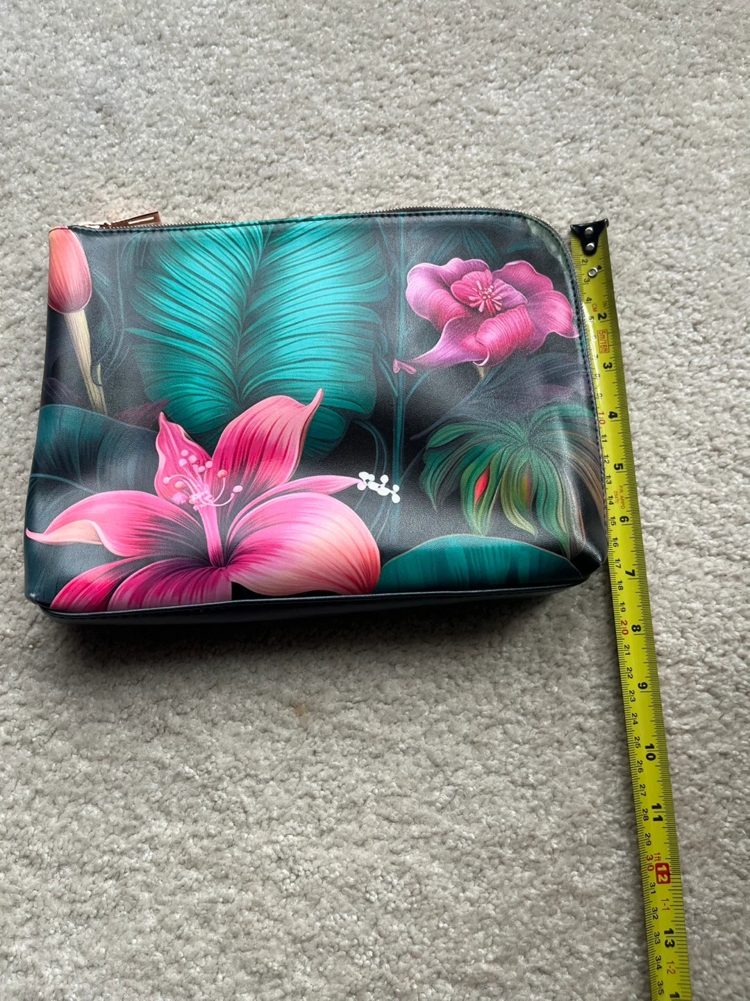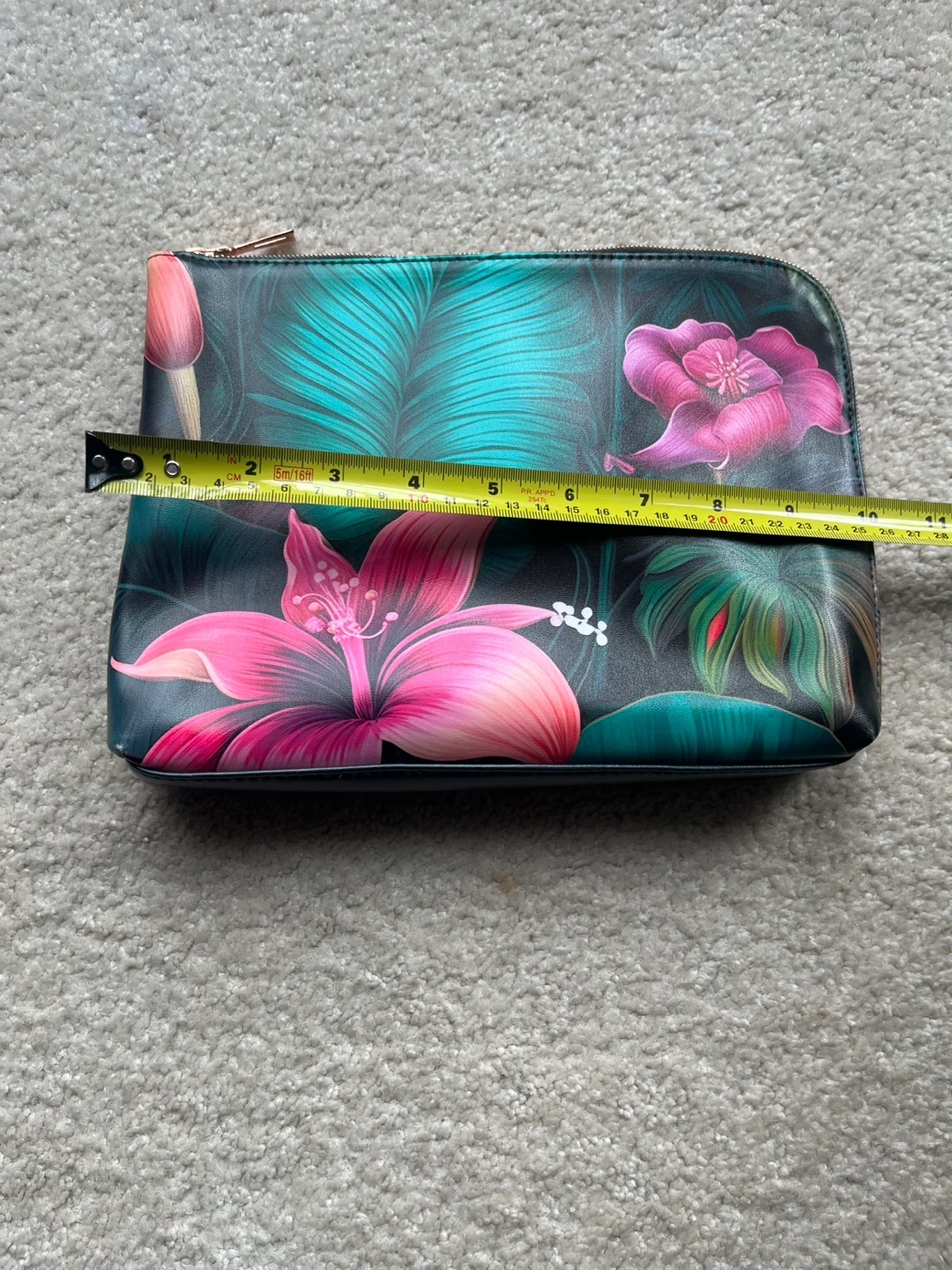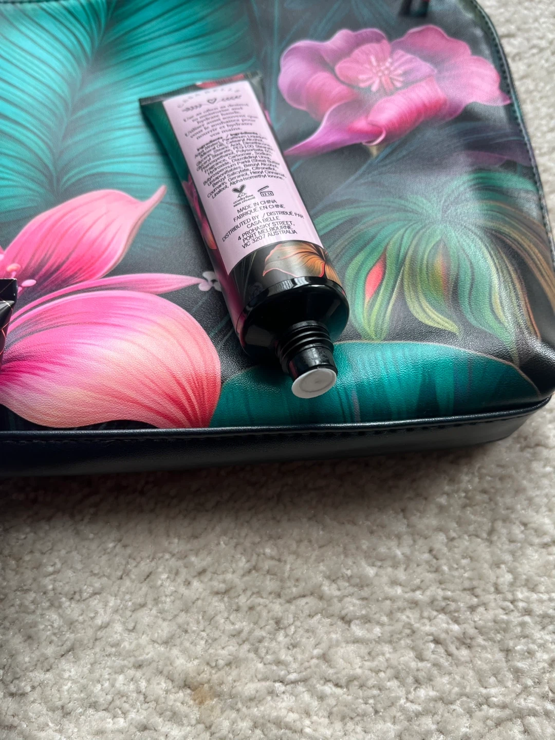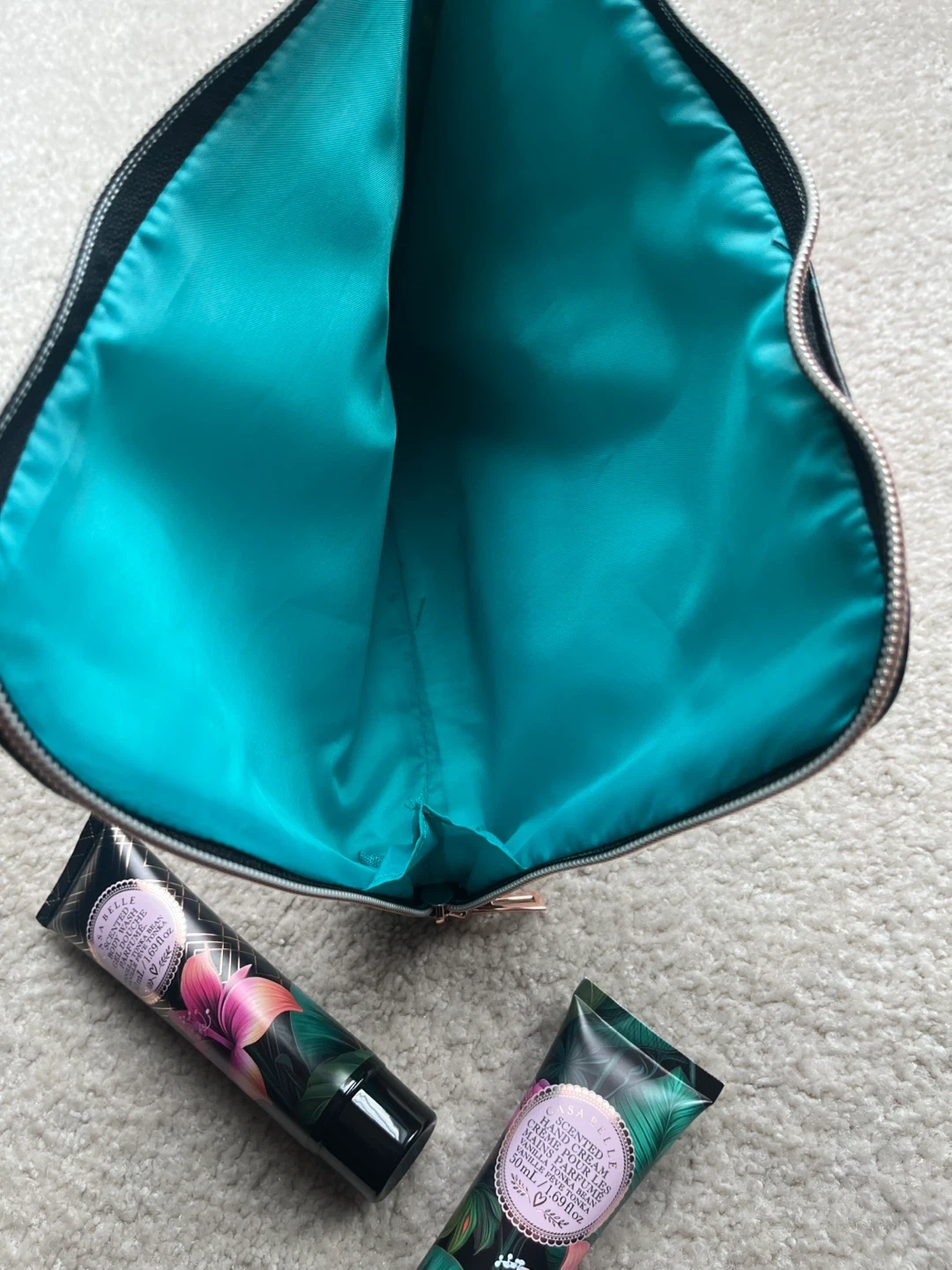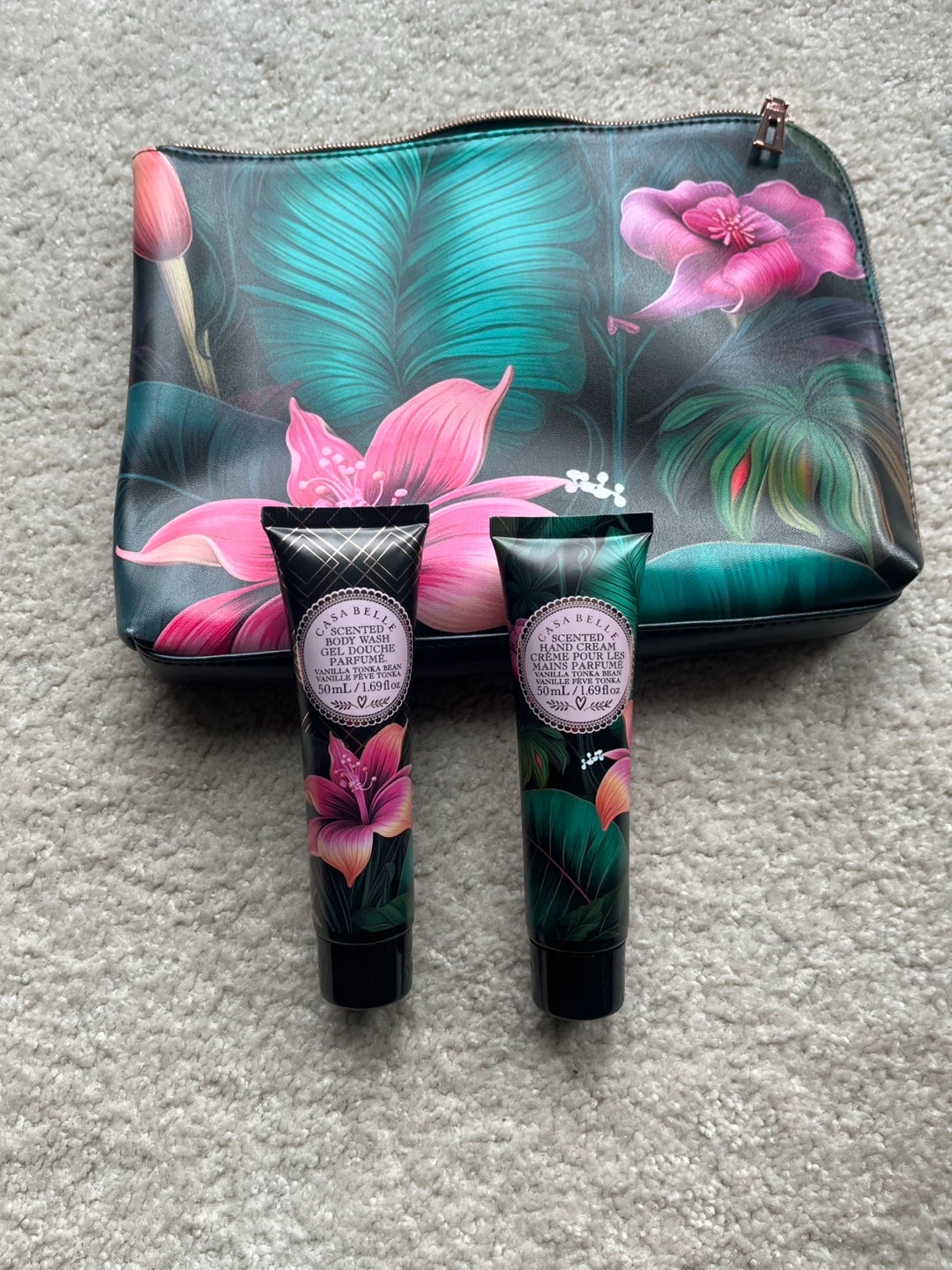 This set includes a vanilla orchid hand cream and a vanilla orchid body wash. Both tubes are 50ml. The pouch has a vibrant tropical floral design and measures about 10 inches wide by 7 inches tall.