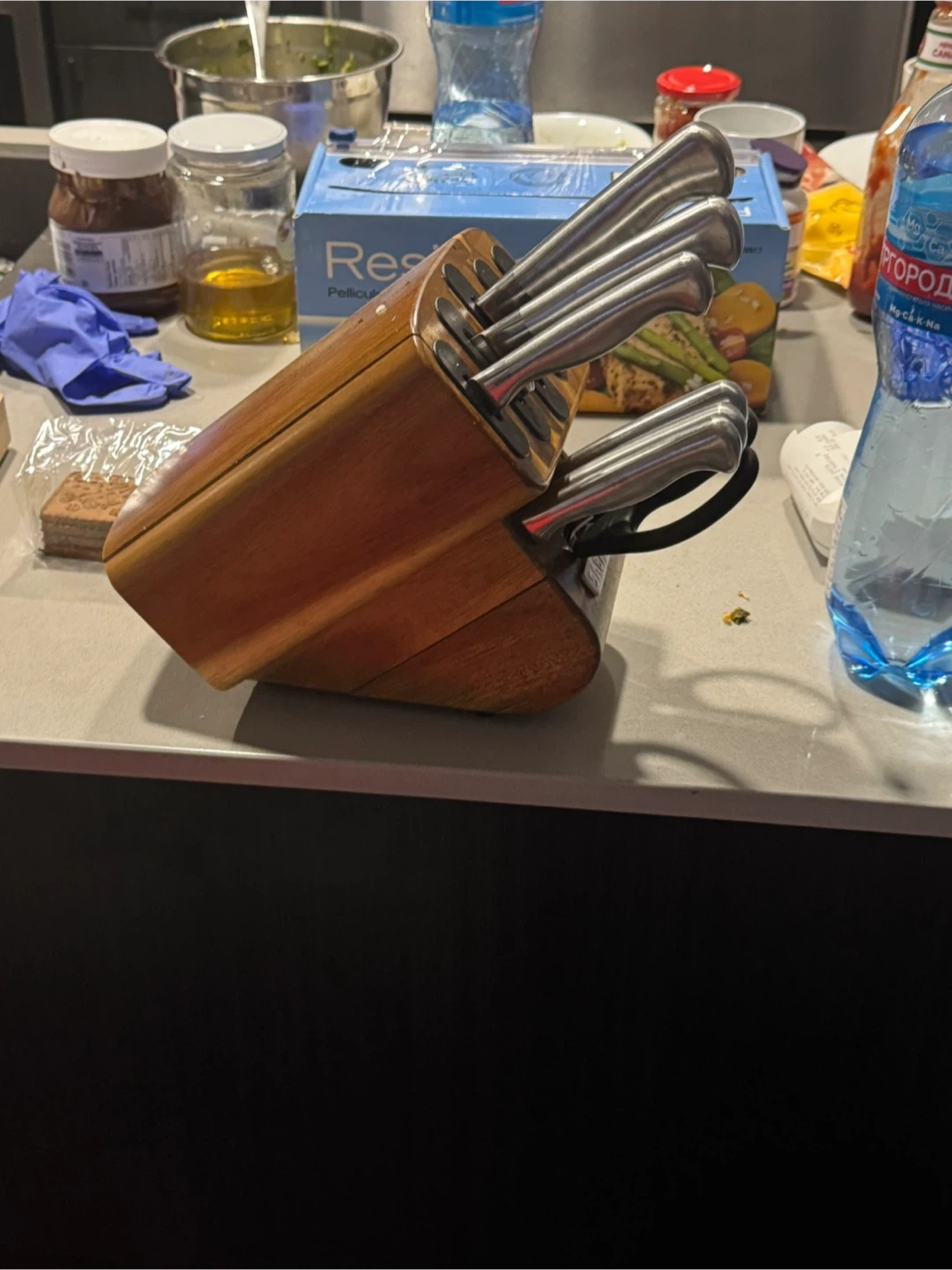 Selling a Sabatier knife set ( only the number of knives shown in the picture) with it’s wooden block. The set includes a variety of knives and kitchen shears and a scissors