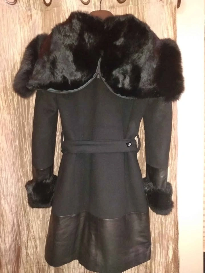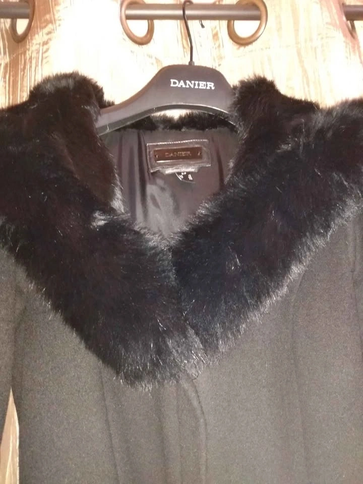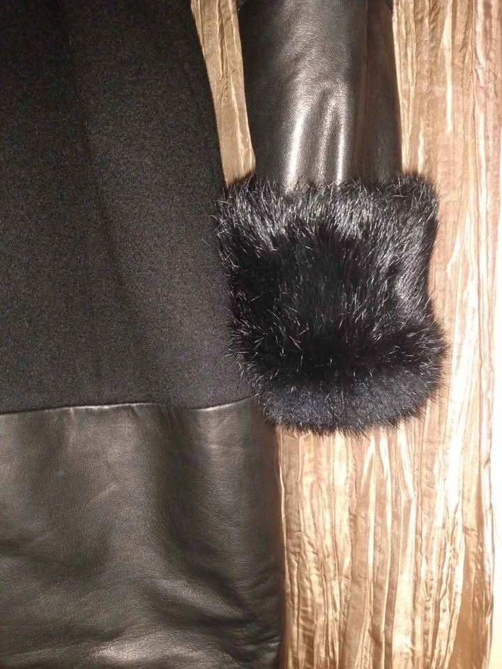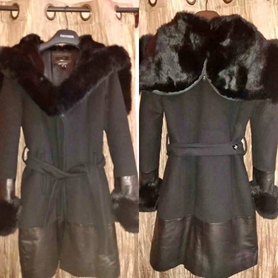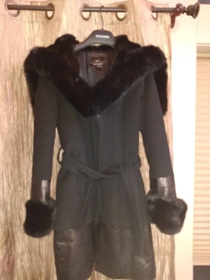 Like new Danier wool and leather coat with genuine fur collar and cuffs. Made with patented Thinsulate making the coat lightweight, tailored and very warm. Gorgeous on.