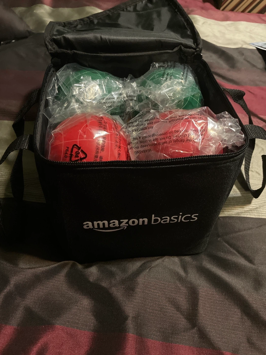 This Amazon Basics bocce ball set includes a durable carrying bag. It contains four red and four green bocce balls. Perfect for backyard fun or park outings!