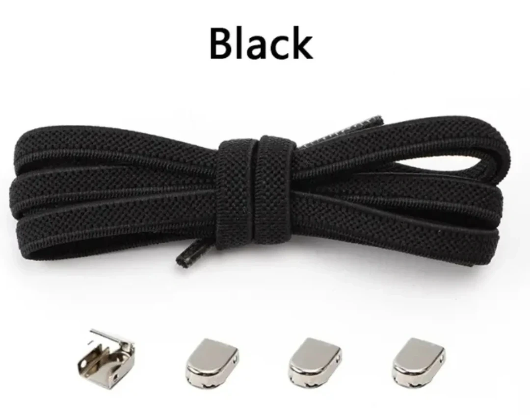Comes with black elastic shoelaces and metal lock fasteners. Each lace measures 100cm long and 6mm wide, perfect for no-tie convenience. Easy to install on any shoe!