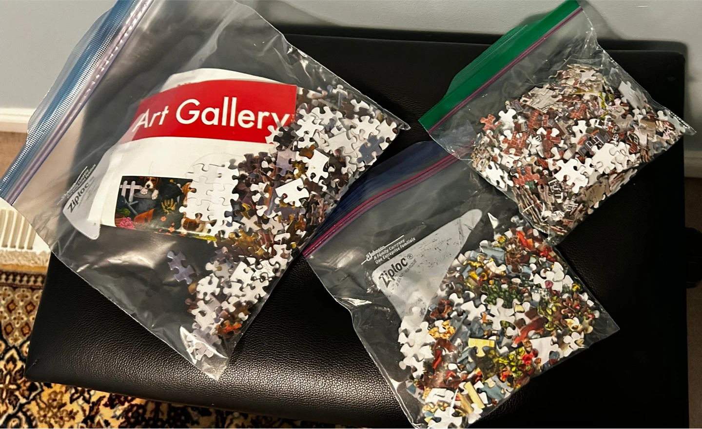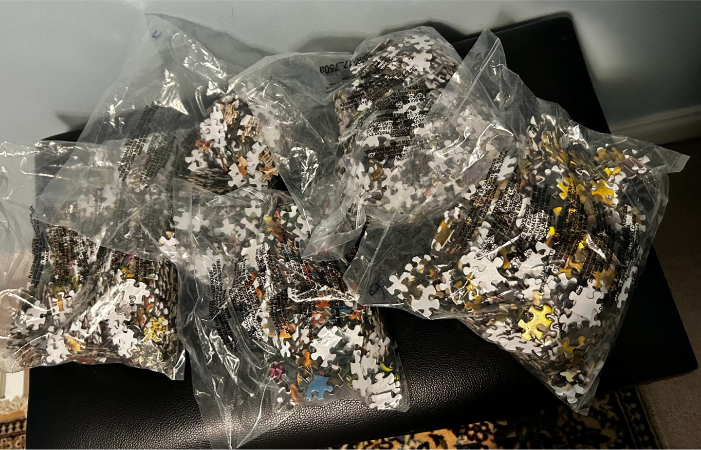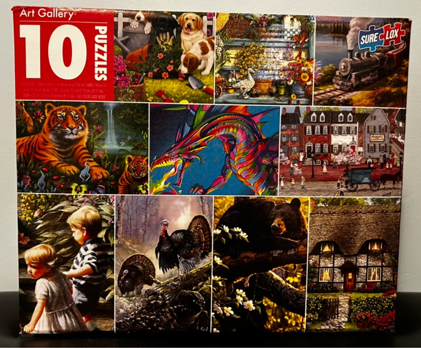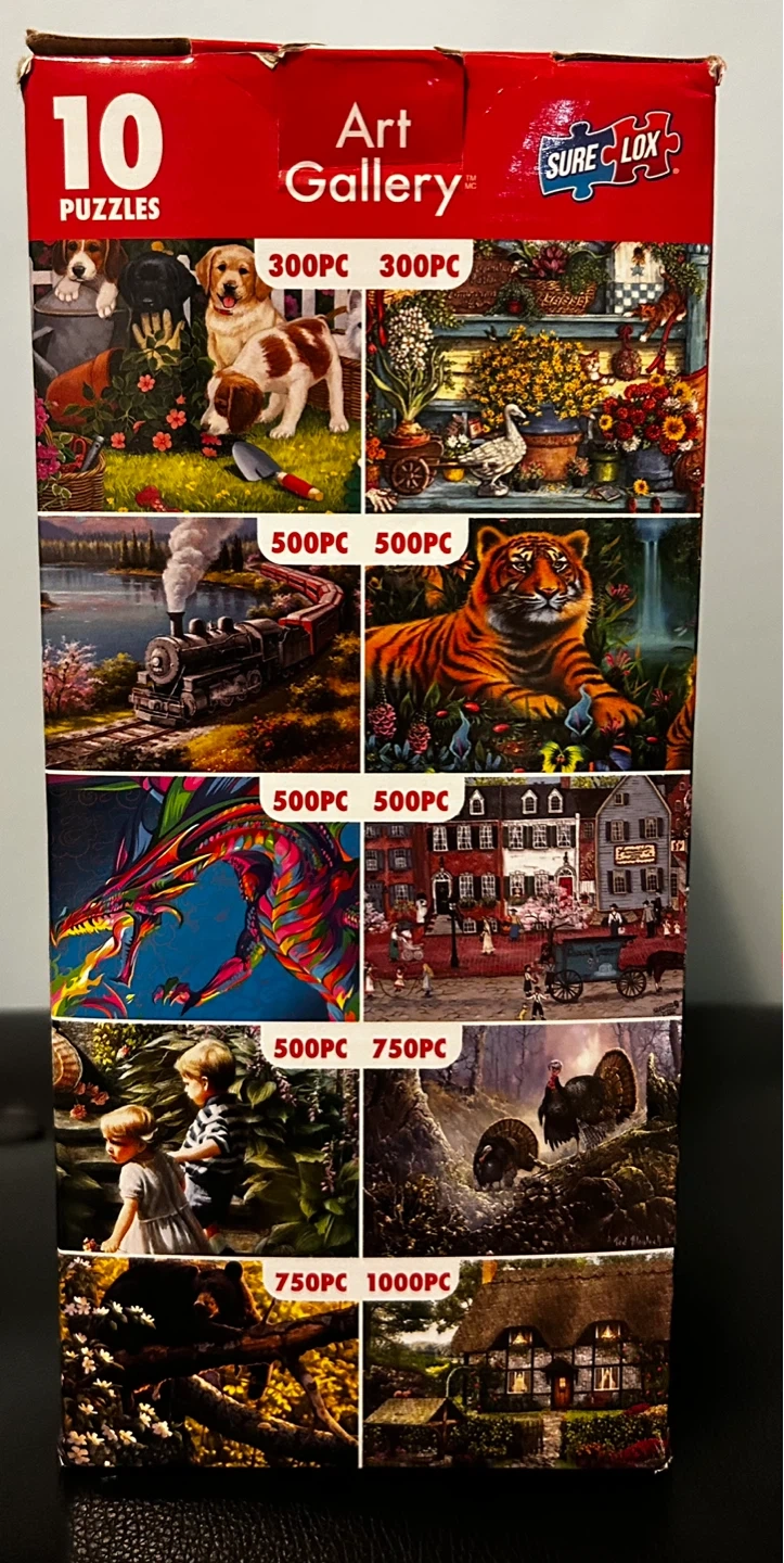 Selling a Sure-Lox Art Gallery puzzle set, which includes 8 different puzzles! The puzzles range from 300 to 1000 pieces. All pieces are bagged separately for convenience. Five set are brand new sealed.