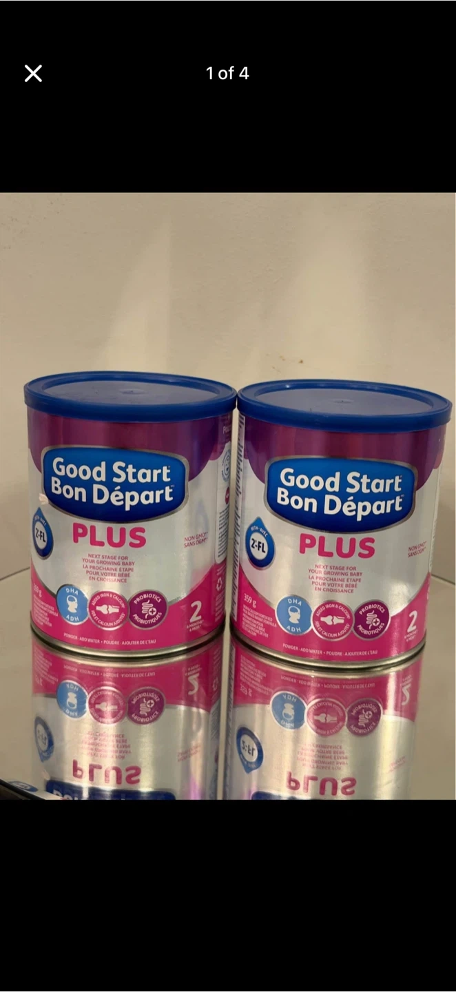 Two cans of Good Start Bon Départ PLUS Stage 2 baby formula. Each can contains 359g of powder. It's formulated for growing babies and includes DHA and probiotics.each cans $15
